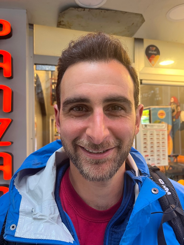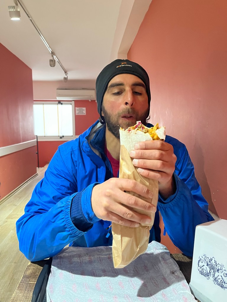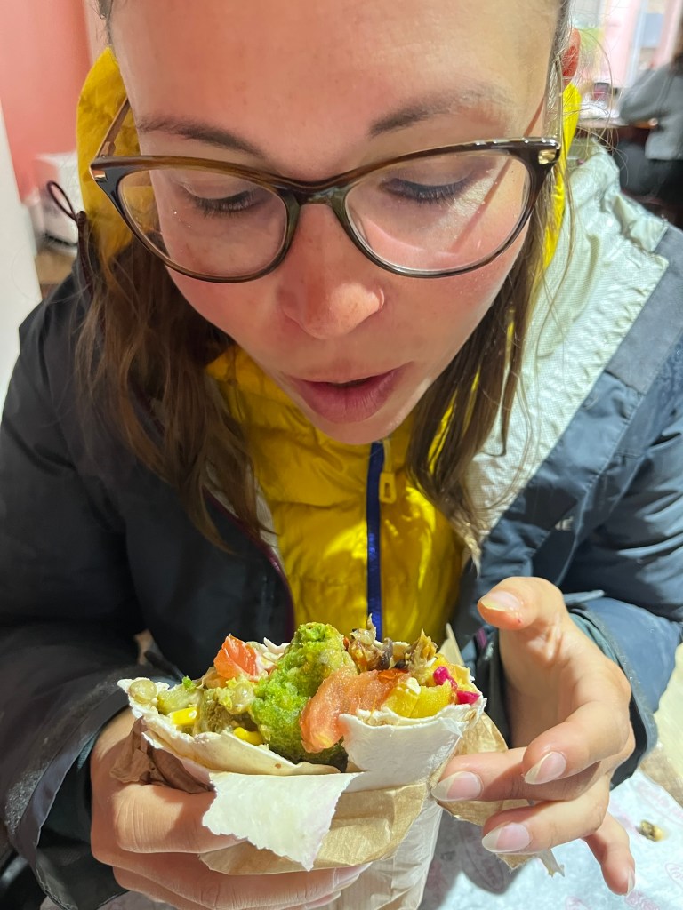 We snuck inside just as the rain picked up. They sold wraps with a little buffet of fillings including falafel, chips and salads. Not everything was vegan but they told us what was what. We also bought a cup of vegan ‘aryan’. It’s a very popular yoghurt drink, in Iran too. It wasn’t the greatest taste to us, but worth trying at least once. The restaurant was popular with young people, mostly women. Perhaps students.