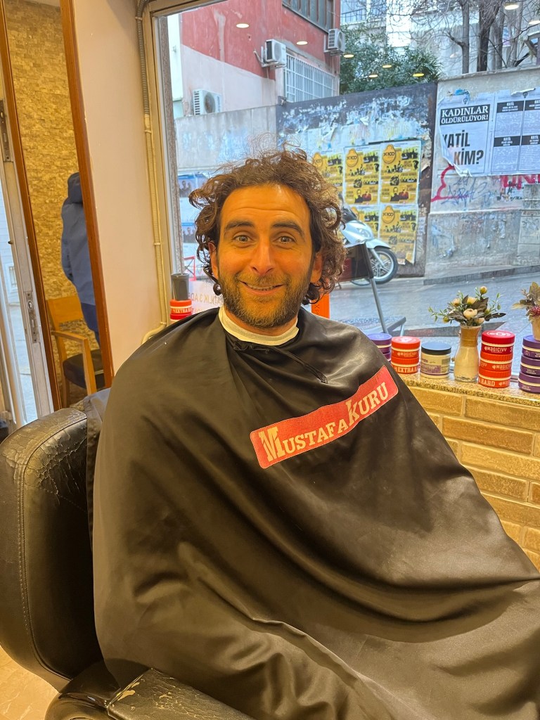 The rain had stopped being so vigorous. We headed to a nearby barber shop. Jonathan hadn’t had his hair cut in many months and we found a recommendation online. It took a couple of tries to communicate how much hair Hussein the barber should lop off. It was a thorough haircut, beard trim and then washing. He even stuck his fingers in Jonathan’s ears.