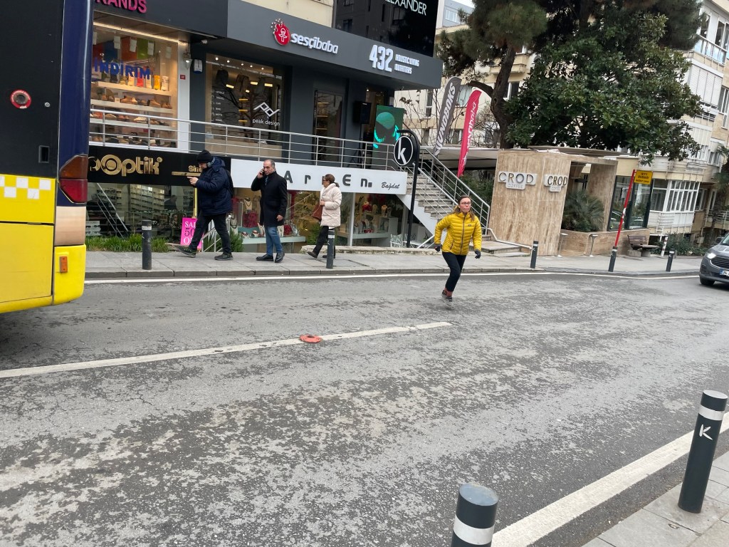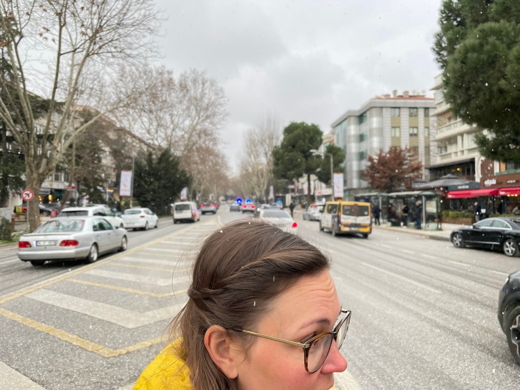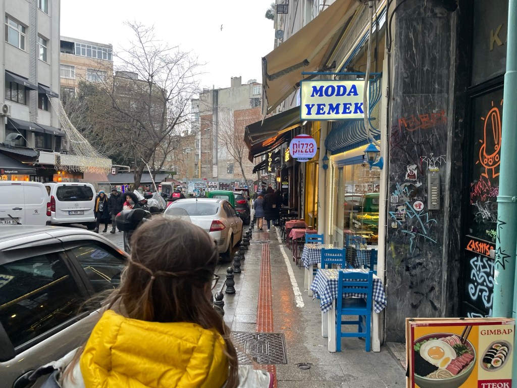 It started to snow. We were walking down Bağdat Caddesi back towards the Bosphorus. It was about 4km down the busy shopping avenue. Now we were in Asian Istanbul there weren’t any tourists but us. It was a typical city scene. The snow turned to rain. We almost got a bus but ended up walking the whole way to the cheap vegetarian restaurant we’d found.
