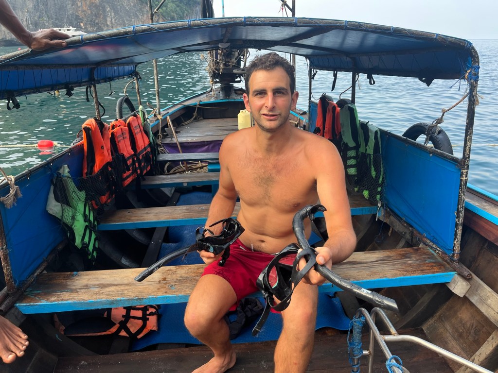 There were set combinations of places that you could visit around the two islands depending on how much time you were willing to pay for. We’d settled on 4 hours and this covered Phi Phi Lee and Shark point. So Gis took the boat round the west coast of the island and to the opening of Maya bay. We could snorkel in the bay but it wasn’t particularly good and there were already lots of people. Gis had started eating his bag of rice he had picked up from the bar at the start. We told him to relax and take his time.