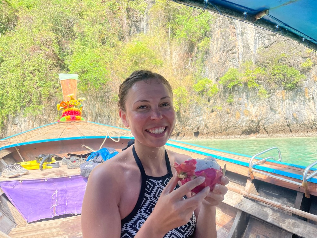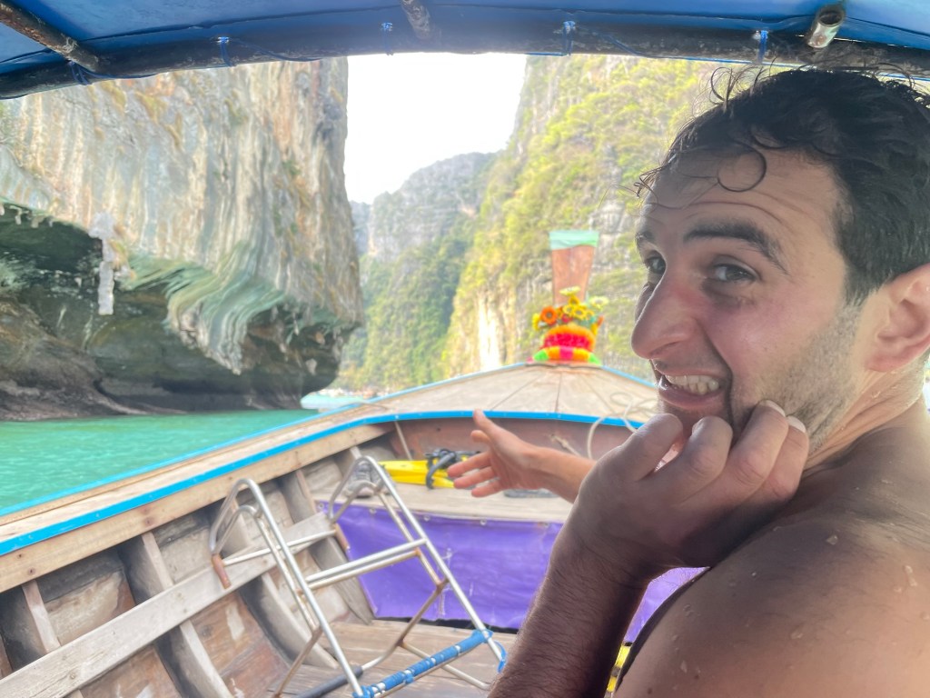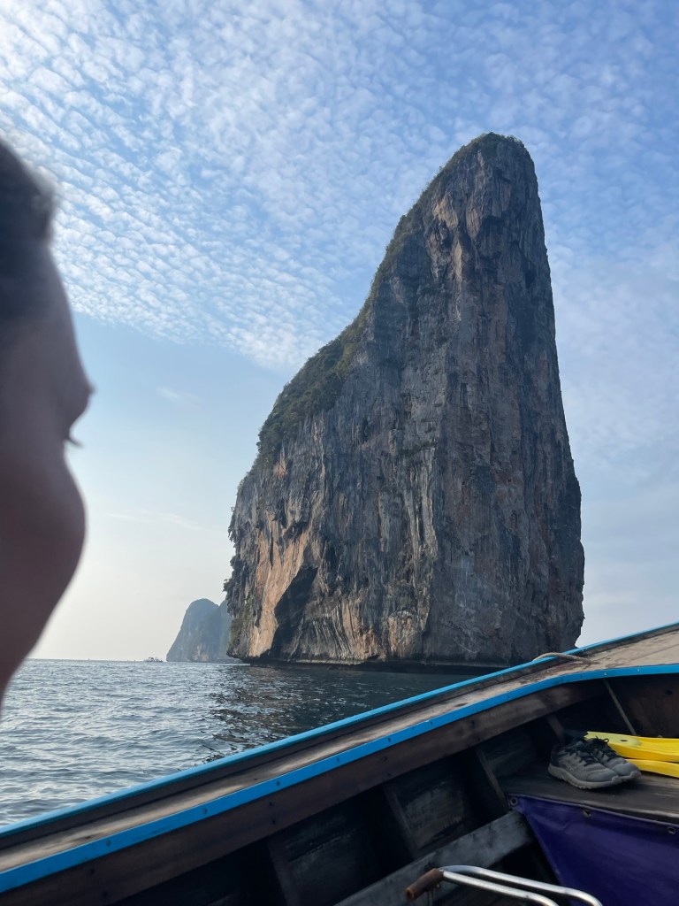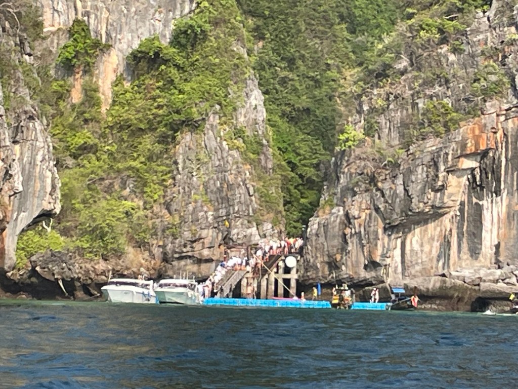 The beach at Maya bay had been closed for three years up until October 2024 due to over tourism. You can no longer swim in the water, only dip your feet in. And boats can’t land on the beach in the bay. They have to go around the back. Gis seemed to ask us if we wanted to go in a somewhat skeptical manner. He reminded us of the 400 baht fee, each, to enter the national park. We took the hint. As we passed the entrance point at the back there were lines of people marching up some steps. It was a money printing machine.