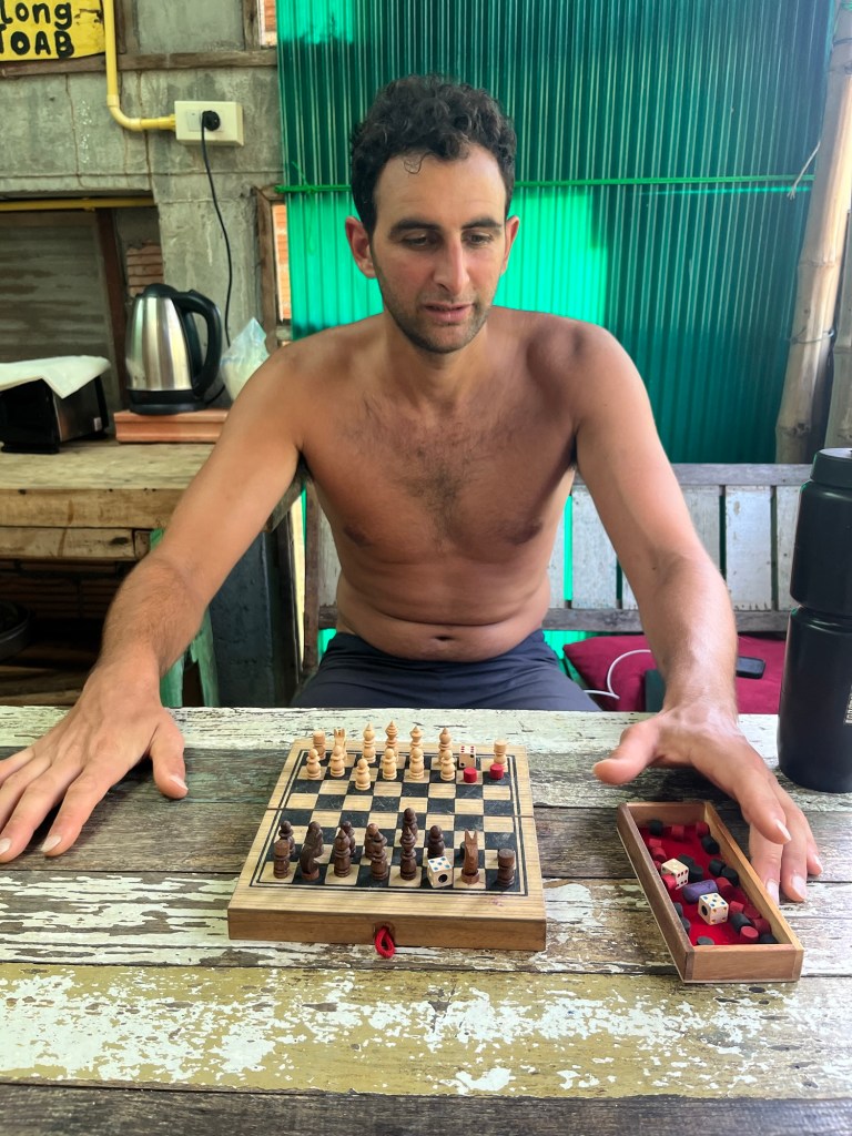 There was always the option of a shower to cool off with fortunately. To while away the afternoon we played chess. Frankie had never played before so was learning afresh. Jonathan couldn’t remember which way round the king and queen went, or which colour square goes in the right hand corner. We ended up watching some television, White Lotus, after playing one game. The heat didn’t lend itself to mental focus.
