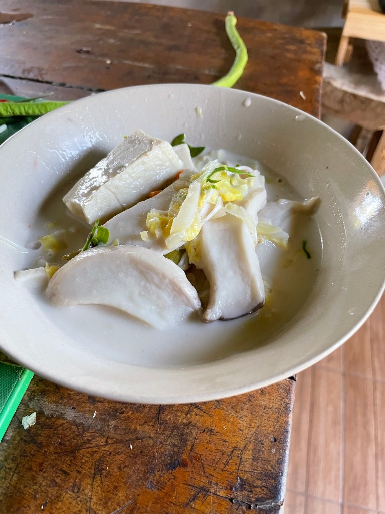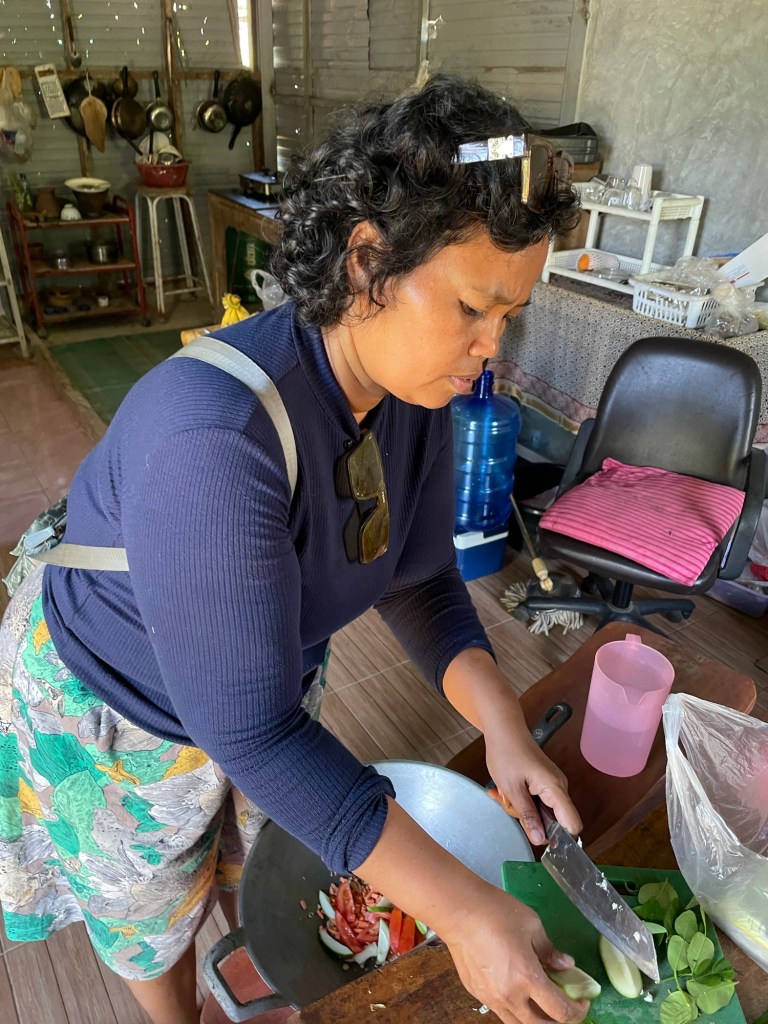 When Jonathan went to start cooking Khem came straight in to assist. She was keen to show him how to prepare the food and Jonathan was more than happy to be instructed. She suggested slicing the lemongrass and galangal thinly, so it can be easily eaten. Thai food is very fragrant and only lightly cooked. There is very little simmering. Once everything was cut it only took ten minutes. Khem claimed that the spores of mushrooms caused cancer. We weren’t sure what to make of that.