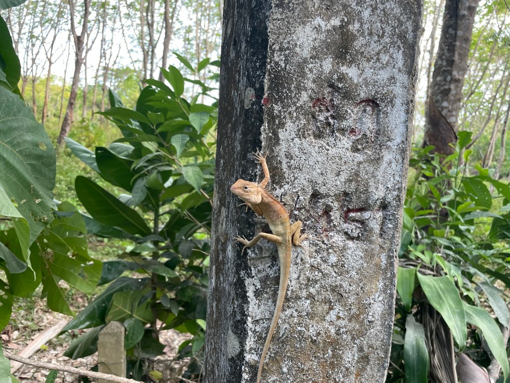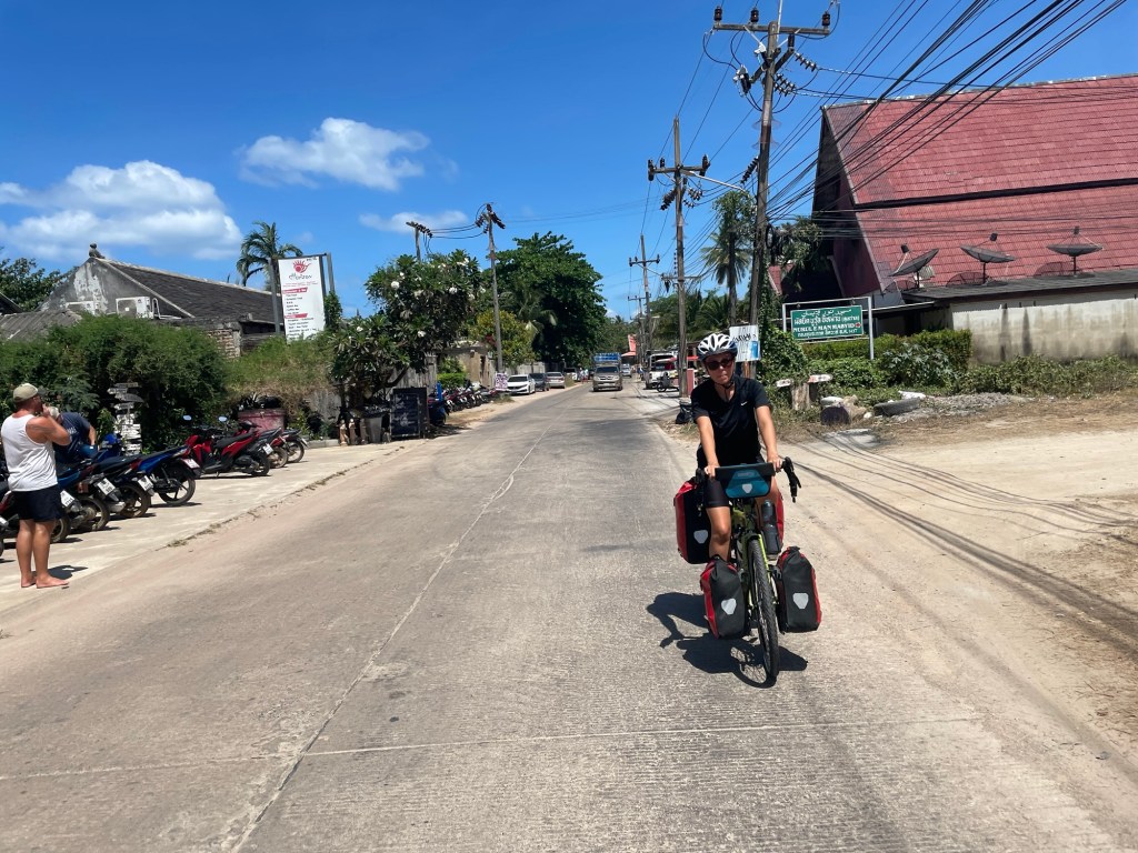 It was only 5km to the next place. We’d decided that we’d get away with riding such a short distance in the heat of the midday Sun. The road was packed with scooters. They’re really an important feature of Koh Lanta. We think a shared e-bike scheme would be better. Or at least shared scooters. It seems daft to us to have so many. On the main road there were still few trees, so no shade. We rode down the now familiar road to the Lotus, then turned right toward the national park.