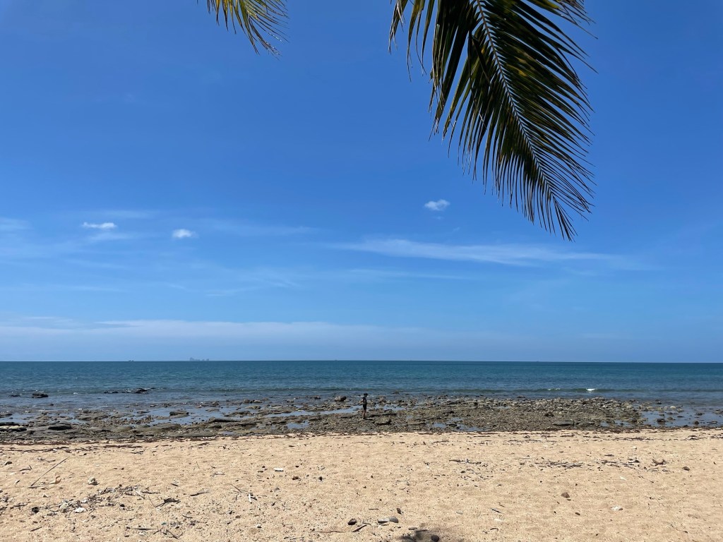 We locked the bikes up and headed to the sea. There was absolutely nothing to do here apart from a couple of sights, drinking, eating, smoking and going to the beach. We’d already learnt this but doing nothing wasn’t Jonathan’s strongest suit. The beach was a short walk through an old broken gate and some light jungle. It was a very rocky shore and Frankie went to find some rock pools. Jonathan sat in the shade to do some writing.
