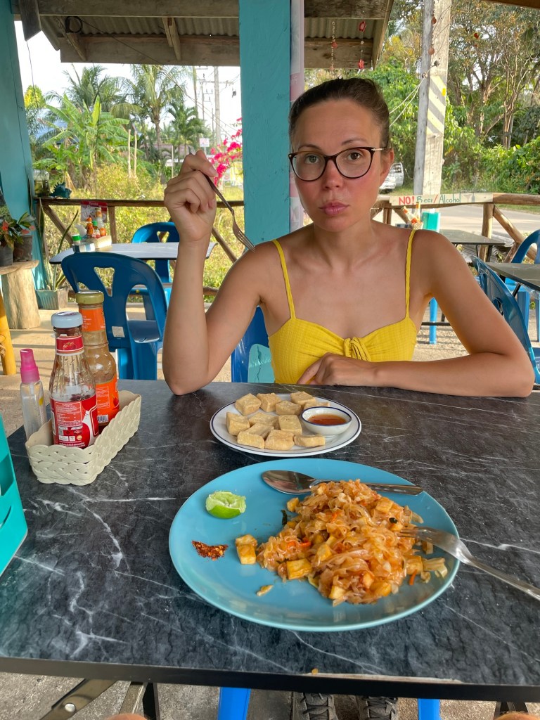 We ate tofu pad thai, papaya salad, fried tofu and tofu tom yum. Lots of tofu. It came out bit by bit. It was extremely delicious and we sweated like crazy. We’d started to learn more about Thai culture. The family sleep in one room on the floor. The shops and restaurants were simply extensions of their houses. This woman had several more children that appeared and her husband arrived home wearing a long gown that complimented her equally completely covered attire. There are quite a few Muslims here.