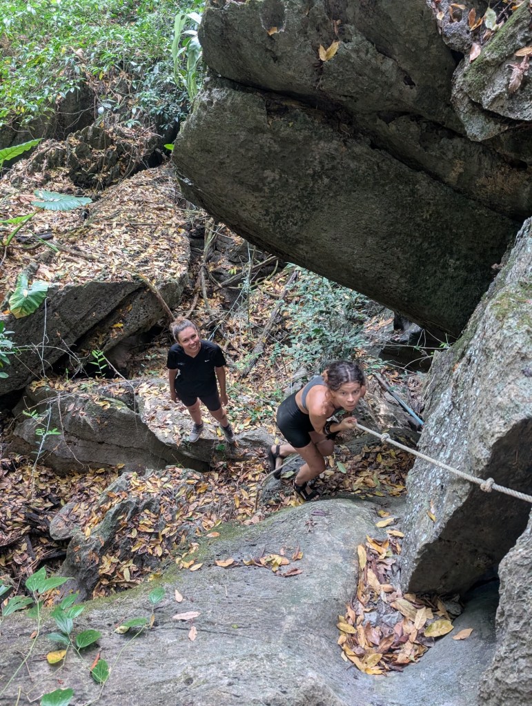 Back outside, not sure exactly where, we climbed a rope then followed round the edge of the rocky cliff. Jero was keen to climb up higher. He’s also an avid climber, planning to climb some karsts in Krabi. Jonathan started following him up the angry limestone, put his foot on a jutting out piece of rock which gave way under his weight, and his shin smashed into the jagged rock. It was bleeding and was more than just a graze.