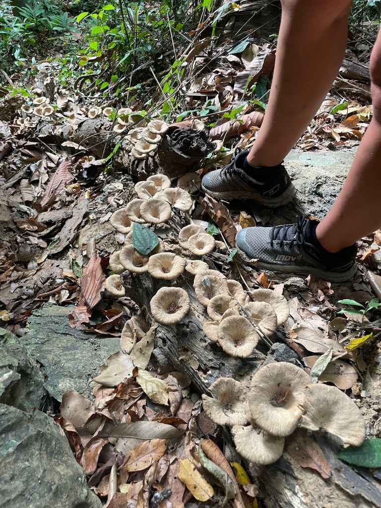 It was a fair way on an obvious but slightly overgrown trail that occasionally took us into a riverbed. There was running water here. The first we’d seen. Also a few plastic pipes that led to the reservoir where the hike began. It was up and down and on slippy rocks and over dusty roots. It surprised us how long it took but we came to the cave eventually. A large rocky limestone outcrop in the middle of the jungle. It was a beautiful place just to be.