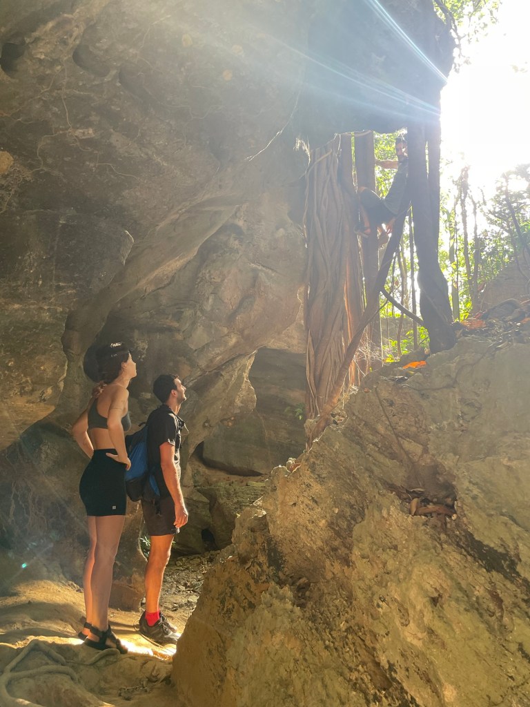 Jero led the way, then Jonathan, then Ana with another light and then Frankie. We saw a couple of bats. There were lots of dead ends and the way through wasn’t always clear. We had to go through some tight gaps on our hands and knees. And once on our bellies. It was tight at times but nothing really claustrophobic. We aren’t sure exactly how long we were in there, but we eventually came to an opening back to the light.