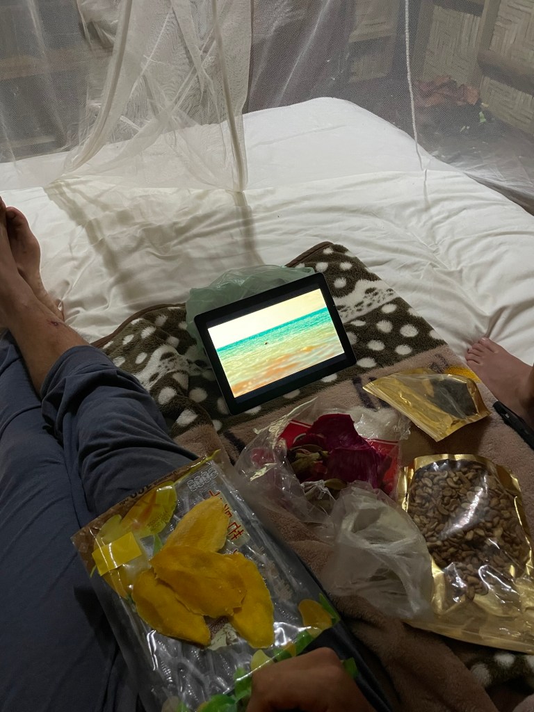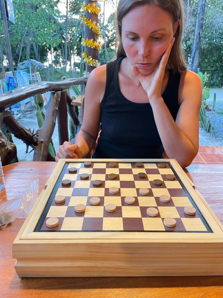 Afterwards we went to the restaurant to play some checkers, which was crap, then some chess which was far more enthralling. Back in the room we ate our cashews, raisins and dried mango. A dragonfruit too. We were still watching the amusing White Lotus. It was set in Hawaii with tropical beaches too.
