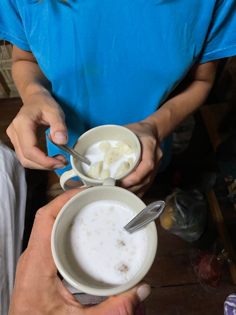 It wasn’t clear that it was a particularly safe route and Jonathan discouraged any further exploration of what would not only be a tricky climb up, but also an unknown descent. We took the ‘path’ back round to the front of the cave. A few minor explorations later and we set off back into the jungle the way we’d come. We mostly followed the river bed on our return. Jero and Ana suggested getting some food. We didn’t normally eat out at half 10 in the morning but went with it.