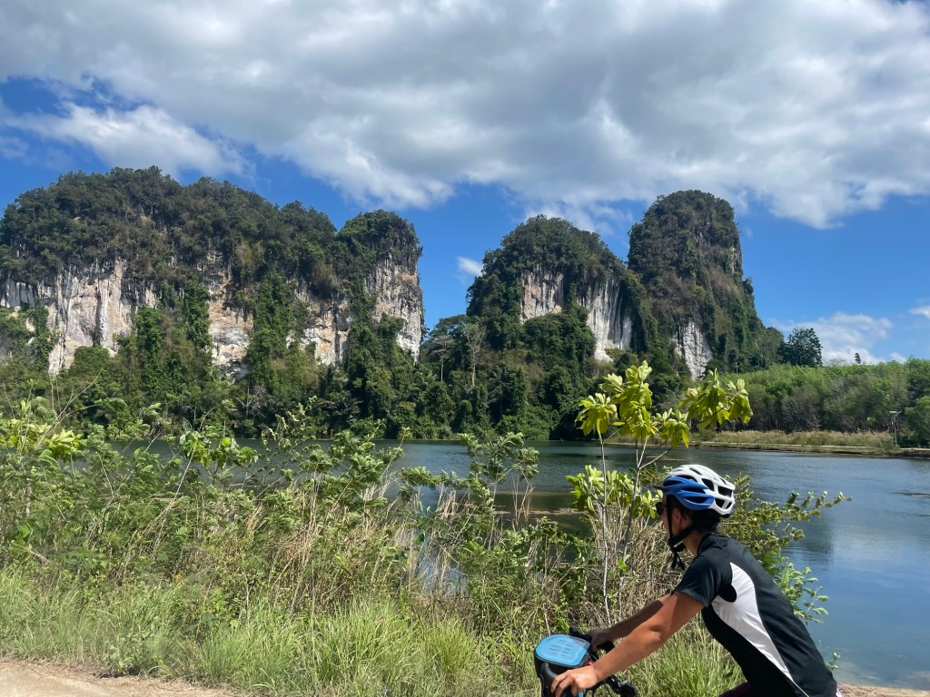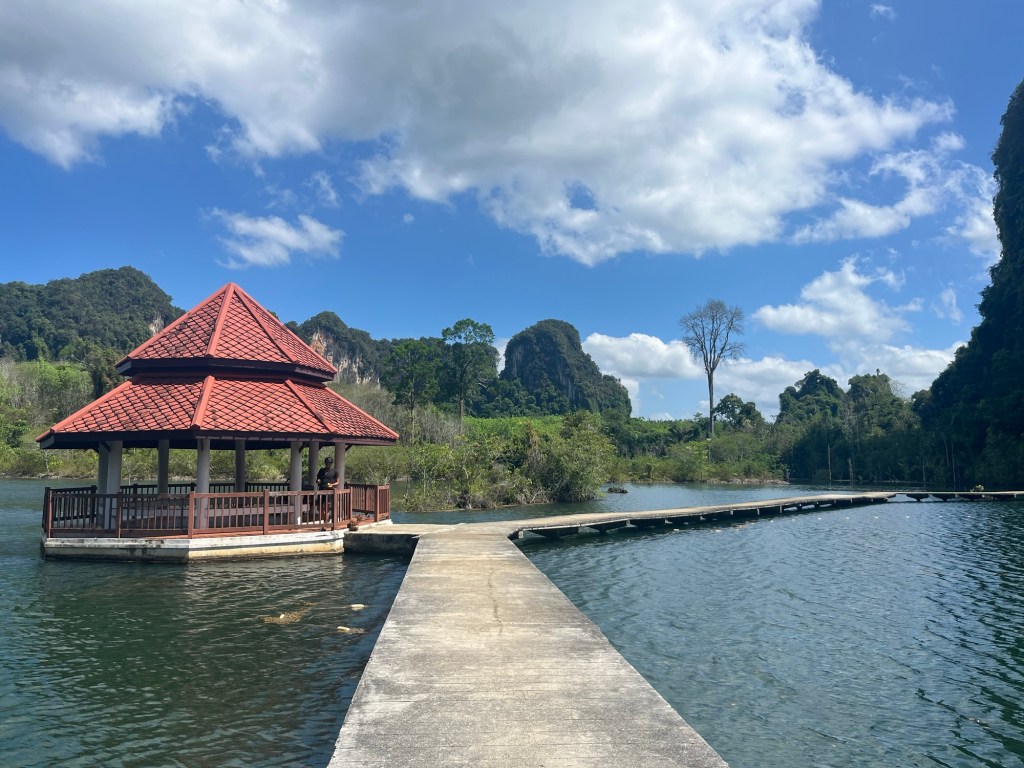 We passed Khao Khoi Dam, not a large blockade that we could see, but a fishing lake at the bottom of some karsts. It was a serene place. We took a break in the gazebo that was in the middle of the water, a strong cool breeze blew towards us and birds swooped around. We ate some banana and papaya.