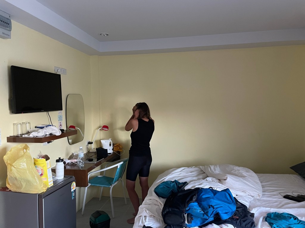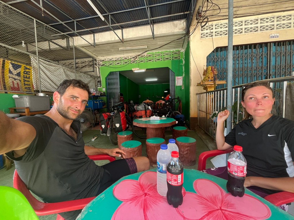 It was already past check in time because we’d started our ride so late. The room looked perfectly reasonable. A little tired but comfortable enough. The bed was a little saggy in the middle. We went to the nearest shop to buy a cold drink and a few snacks. They have little bags of nuts and dried fruits for either 5 or 10baht by the door. We bought a cold bottle of coconut nectar, but it was like drinking sugar and not sufficiently refreshing. We went back for a bottle of orange fanta. Yes, it is junk but it was so hot and it’s so tempting. No, it doesn’t leave you quenched. Not really.