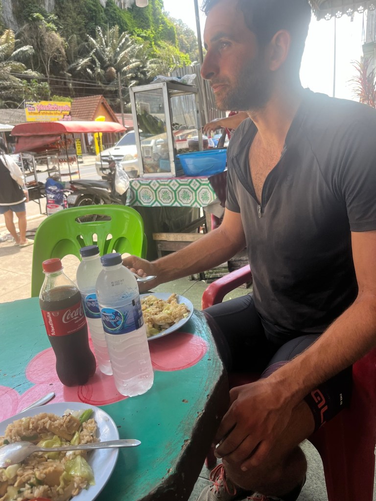 There was a cave we would have liked to explore but we weren’t prepared to pay the high prices to go in. Instead we kept going until we finally had to use the highway. We’d spied a nice vegan restaurant to eat at on google maps. Before we got there we stopped at a fruit stall to stock up. Two large dragon fruit, a guava and some weird molasses drink. Liquid sugar basically. We necked that.