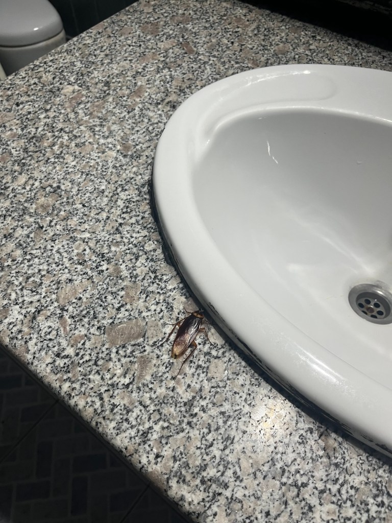 It was a bit disconcerting to say the least. We could hear them scuttling around inside. But then a couple of them dropped out and were obviously distressed. The spray is potent stuff. We put it to the back of our minds. It was only one night and for the price we’d paid it was just about tolerable. Before bedtime there were 4 bigger ones that had seemingly given up and we brushed them into the corner. Not our finest hour.