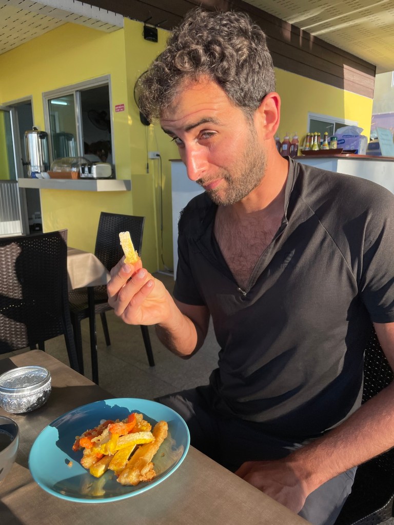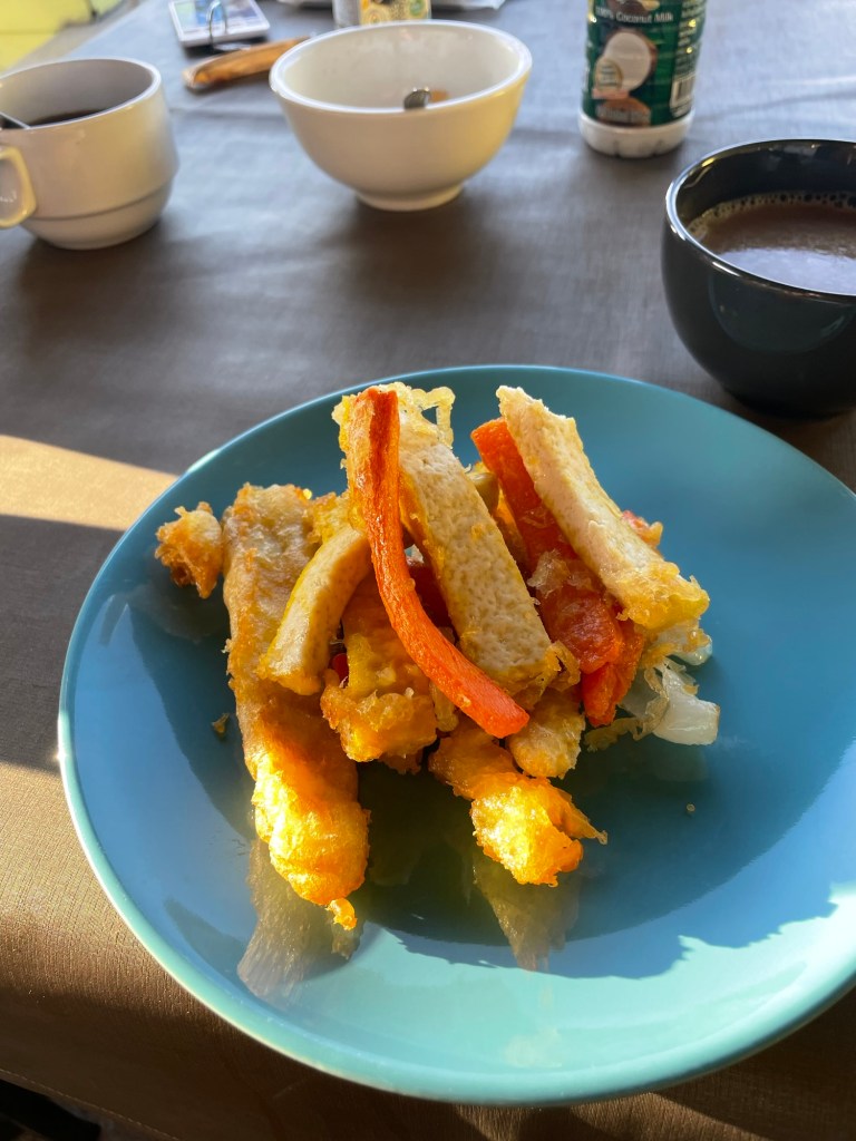 When the food was brought out it was pretty disappointing. We could identify chicken or egg or both in all the dishes. The coffee was instant granules. A tub of melon appeared. That was tasty. Eventually all the dishes had been brought out and we spied something that looked like battered tofu. We’d actually bought some tofu the day before and had a block with us along with some coconut milk and soya milk. We are prepared vegans. When we enquired with google translate it turned out to be egg free, and there were some other vegetables in there too. Finally a cooked breakfast we could enjoy.