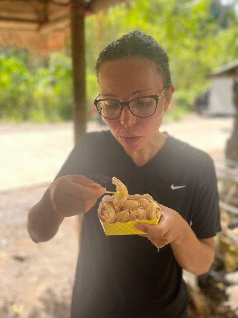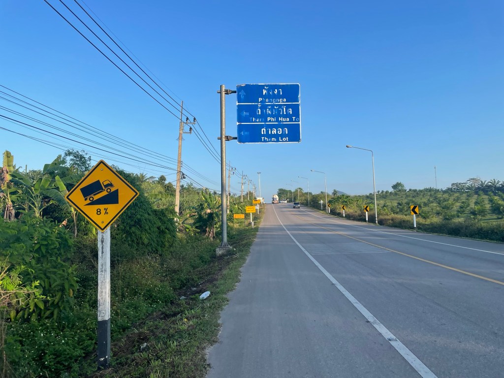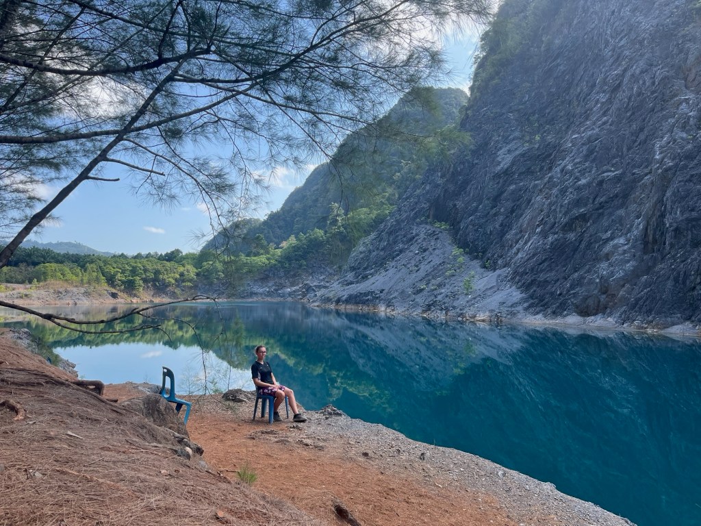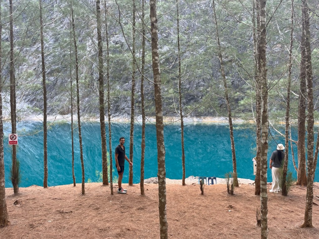 The 4 narrowed into a beautiful single carriageway as it headed up and into the jungle. We started climbing then the hill paused temporarily and plateaued. We took a detour following a sign to. ‘Switzerland’. There was a gorgeous blue lake opposite a quarry. It wasn’t clear if it was man made or not. Opposite there was a long line of stalls selling various foods.
