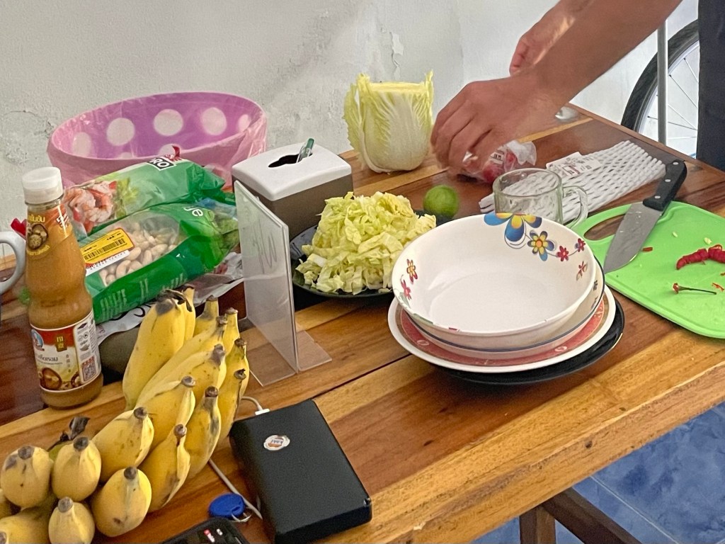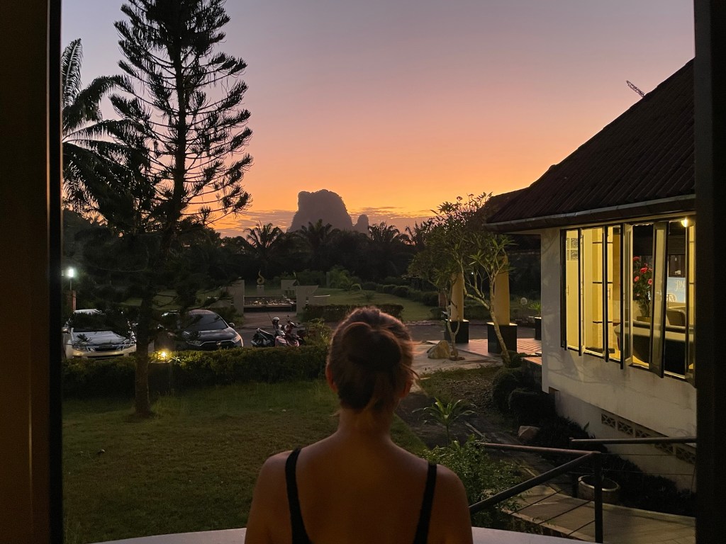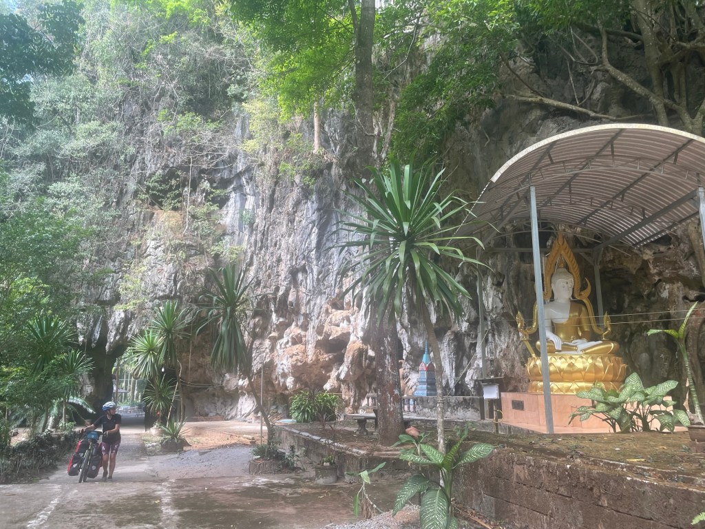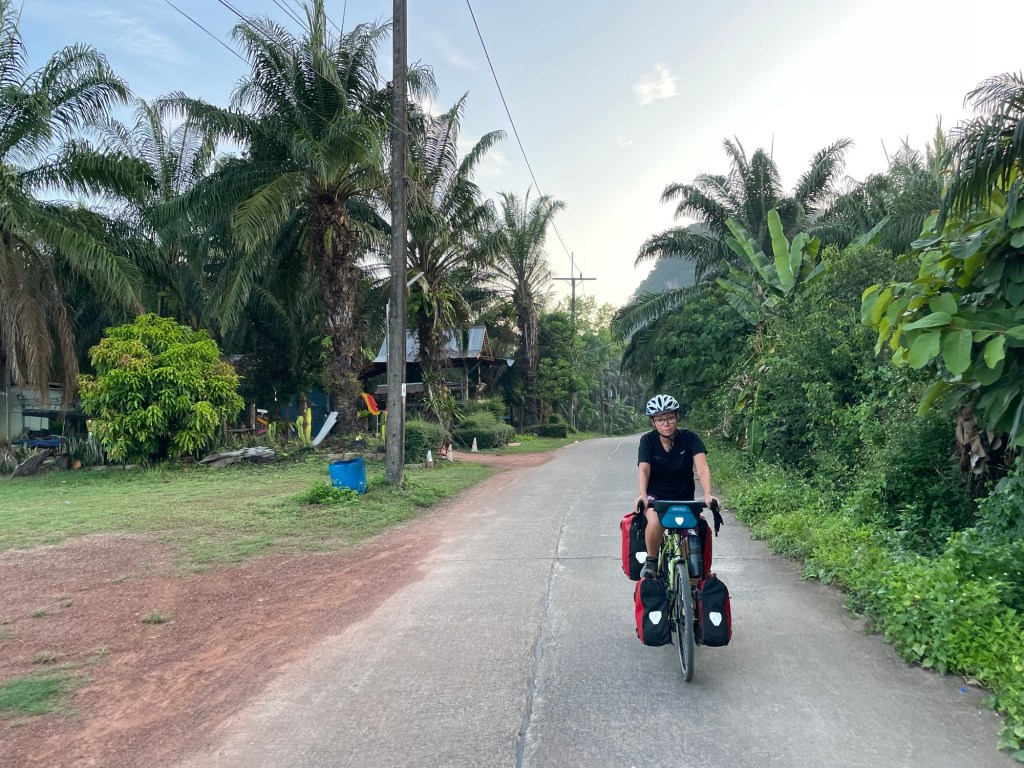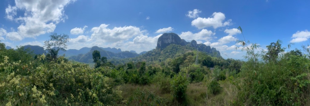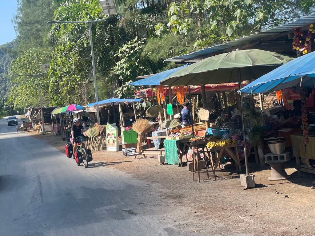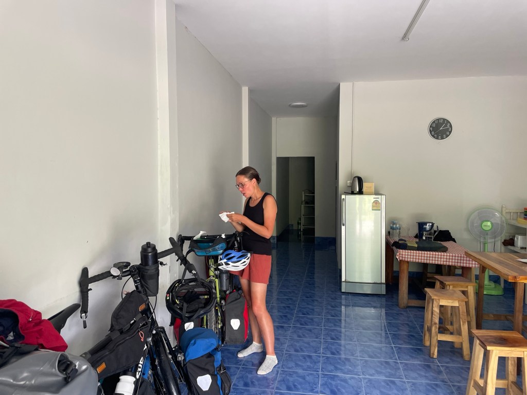 We soon arrived at Zou hostel on one side of Phang Nga. There were ridiculously good views of the karsts that surround the town. When we arrived the man running the place was sat on a table with some friends. He didn’t say much. His friends gestured to us that we should wheel the bikes inside. It was like a proper Thai home. The living space was straight off the street. It was probably a garage though previously.