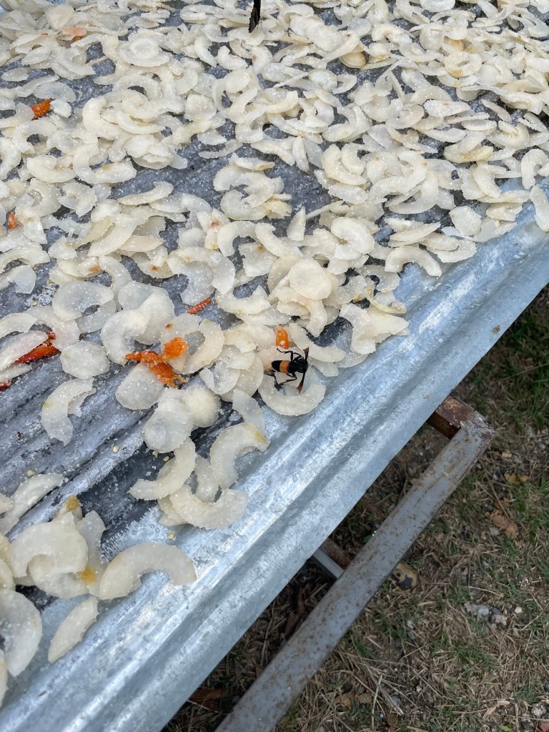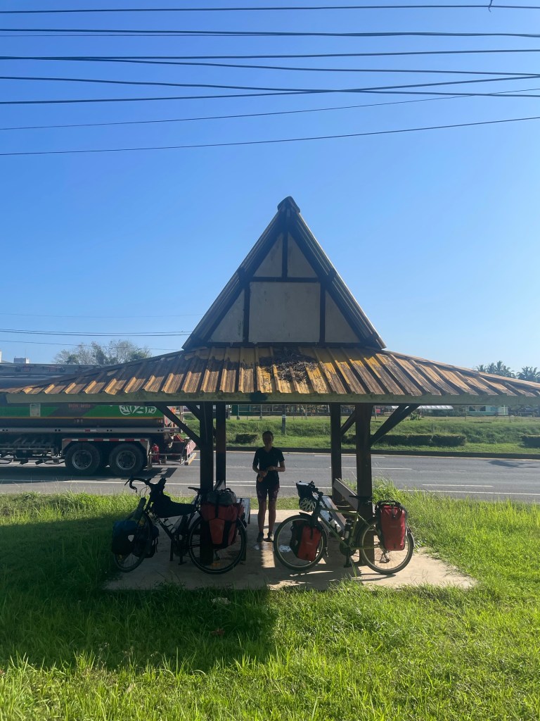 Eventually we came off onto smaller roads surrounded by plantation. We often saw snakes, only small ones mind you, in these ‘habitats’. They’d quickly slither off the road when they noticed our presence. The back road meant we had to backtrack slightly so we could join the 4 again. We decided to have a quick dragonfruit break at the bus stop. We assume they’re bus stops from days gone by. There didn’t seem to be local buses here.