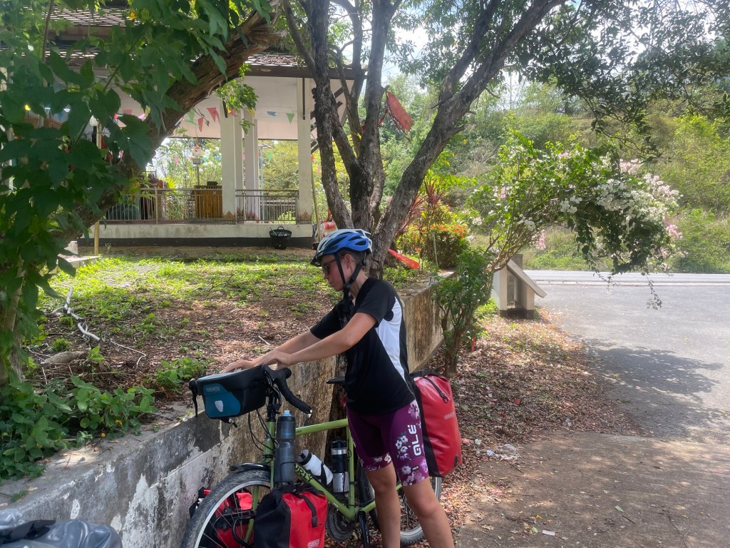 Back to the road and we started going up again. It was our first proper climb in Thailand. There was a sublime flat bit in the middle which had us weaving through gorgeous jungle. The air temperature fluctuated wildly as we went in and out of little pockets of hot and cold air. When we got to the top we stopped and poured water over our heads. There was a viewpoint above us. Jonathan went up on foot but it wasn’t really worth the extra ascent.