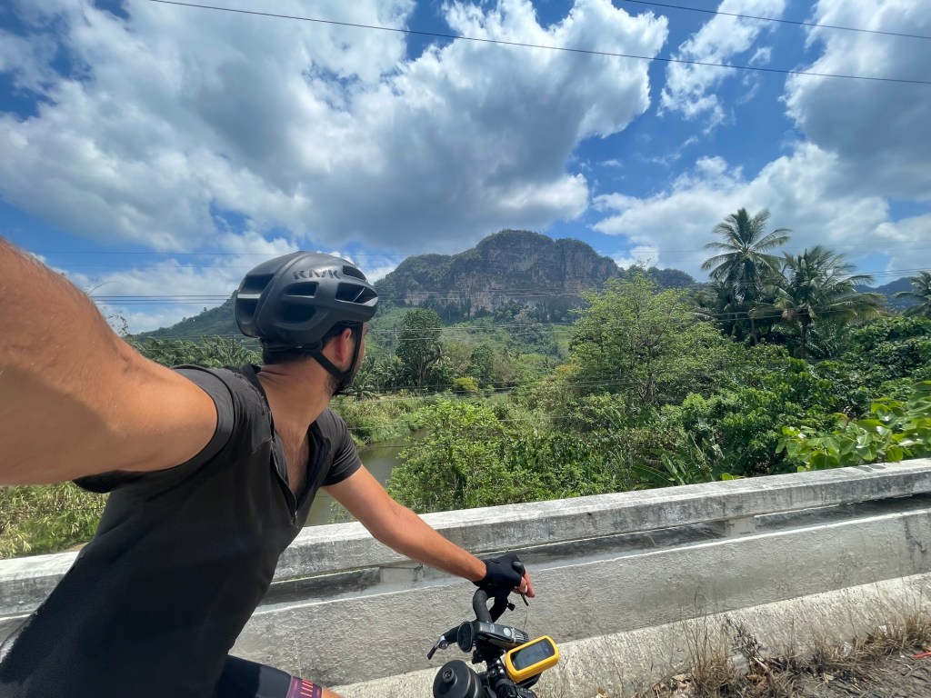 The descent was enjoyable, it snaked down still in the shade. It was nice to be pushing less hard for a while as the rest of the route was a net loss of altitude. The last 7km was on an undulating road however. It really dragged on and the traffic and the midday heat made us long for it to be over. Fortunately we were surrounded by incredible views of karsts.