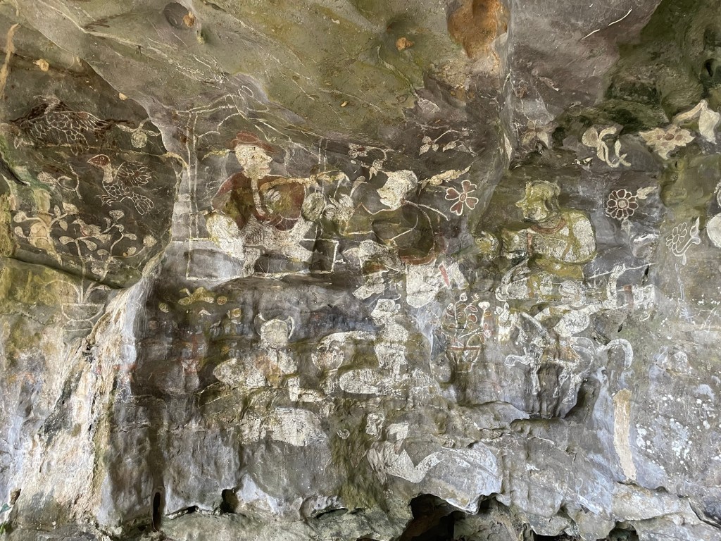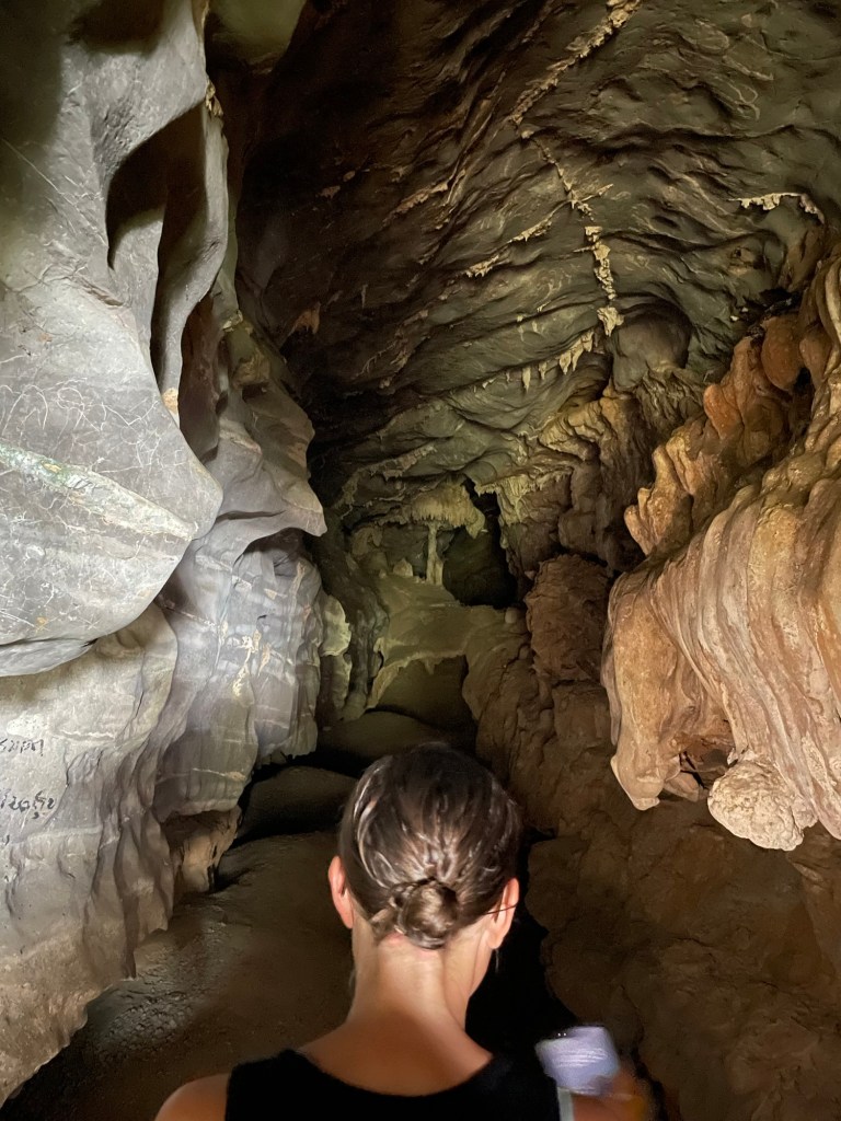 After we’d got sorted and had a shower we headed to the supermarket. A ‘Big C’. On the side of the road as we left the hostel was Tham Sam archaeological site. A gorgeous lake with a pergola. There were a few monkeys grooming themselves too. Then a deep cave with beautiful paintings on the walls. It was completely unprotected.