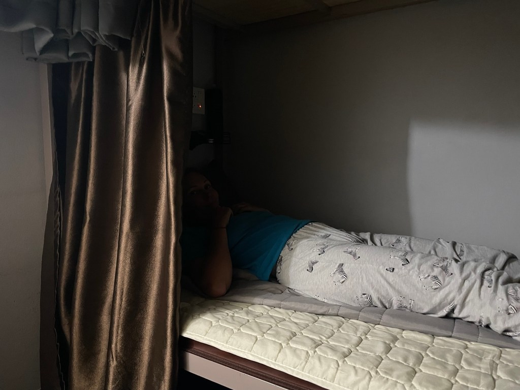 When we got back we ate some snacks and watched a couple of shows. Toxic Town was about the poor decommissioning of an industrial sight in Corby. We tried sitting at the dining table but there were no chair backs. We retired to the beds. They were hard. No movement whatsoever. Two sets of bunk beds with curtains. Enrico sat up outside smoking. We probably should have laid down even earlier. It was almost ten when we finally did. And Frankie felt her belly playing up.