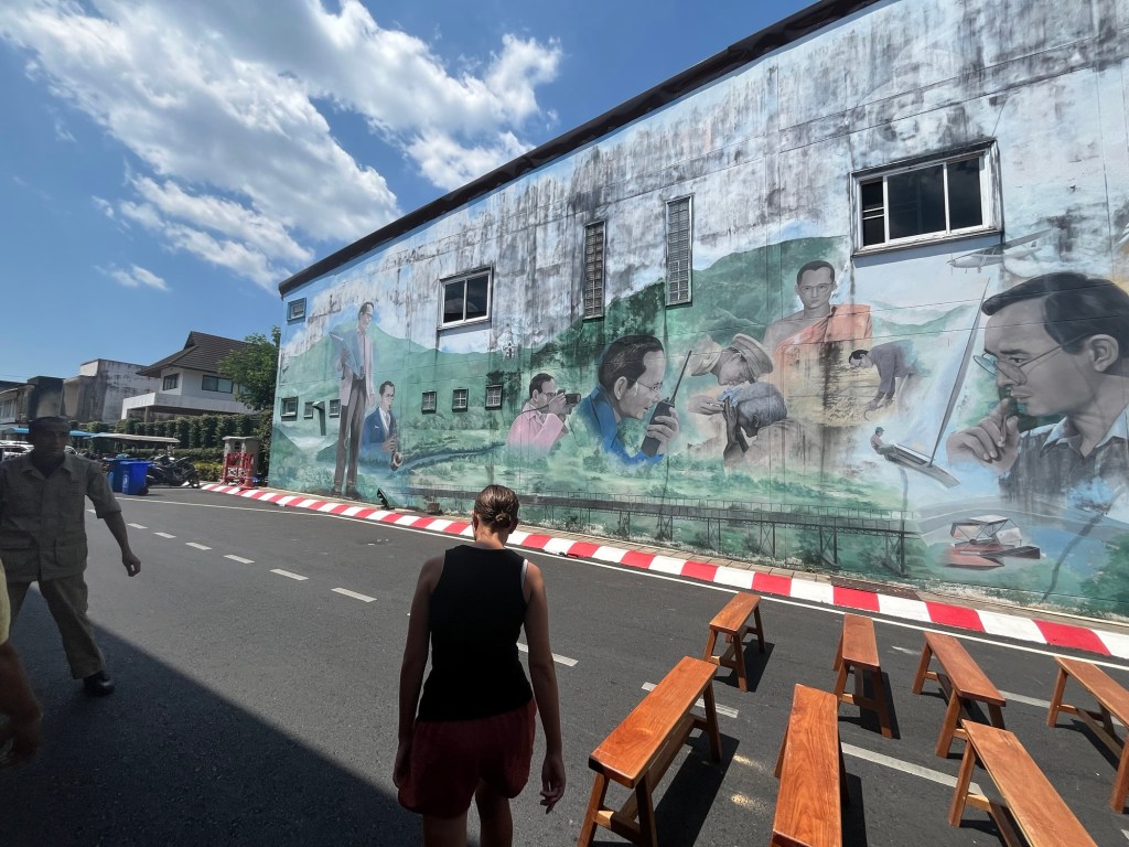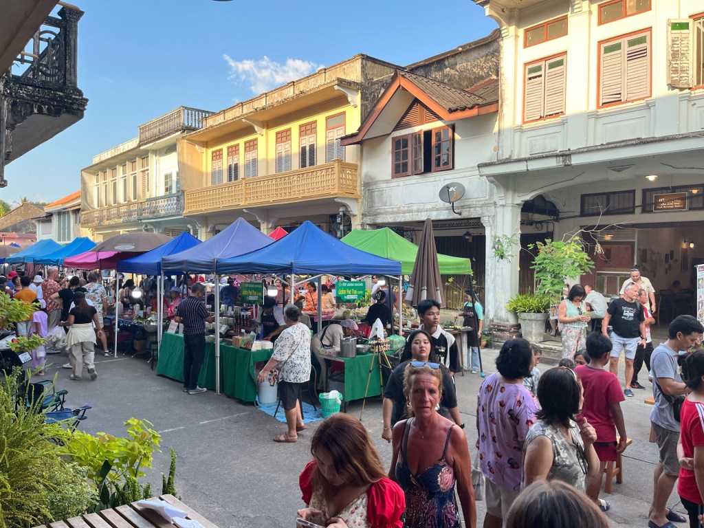 After a little chill upstairs, literally, we were sweating and stuck the air conditioning on, we went outside. The street was now bustling with life. There were stalls up and down selling all sorts of food and craft items. We went for a wander. We couldn’t eat most of it but we did find a cornstarch pudding, sweet potato balls and traditional Thai pancakes with red beans inside. There were performances by local children too. Also dozens of German tourists.