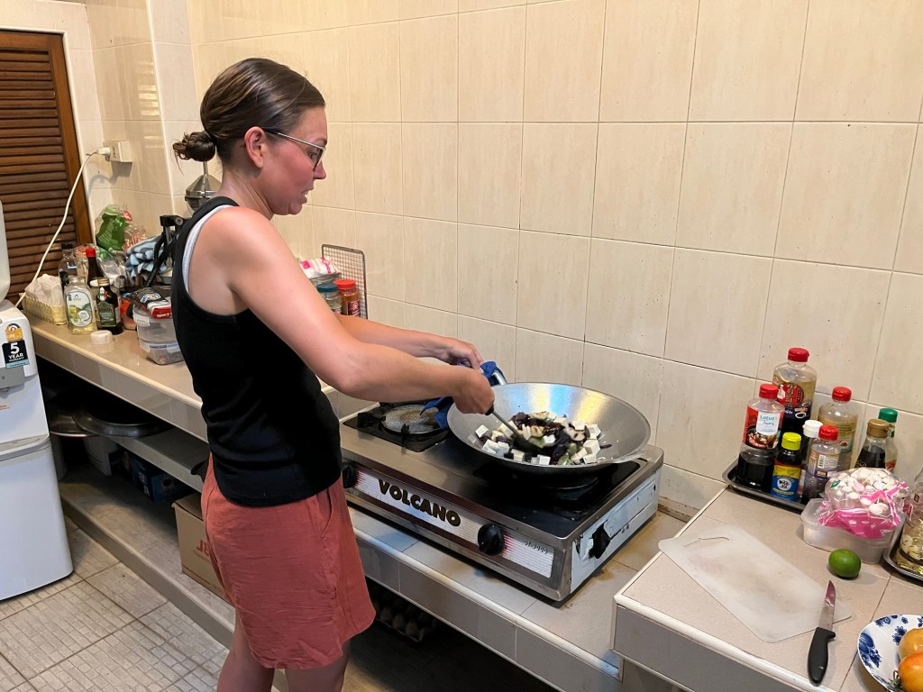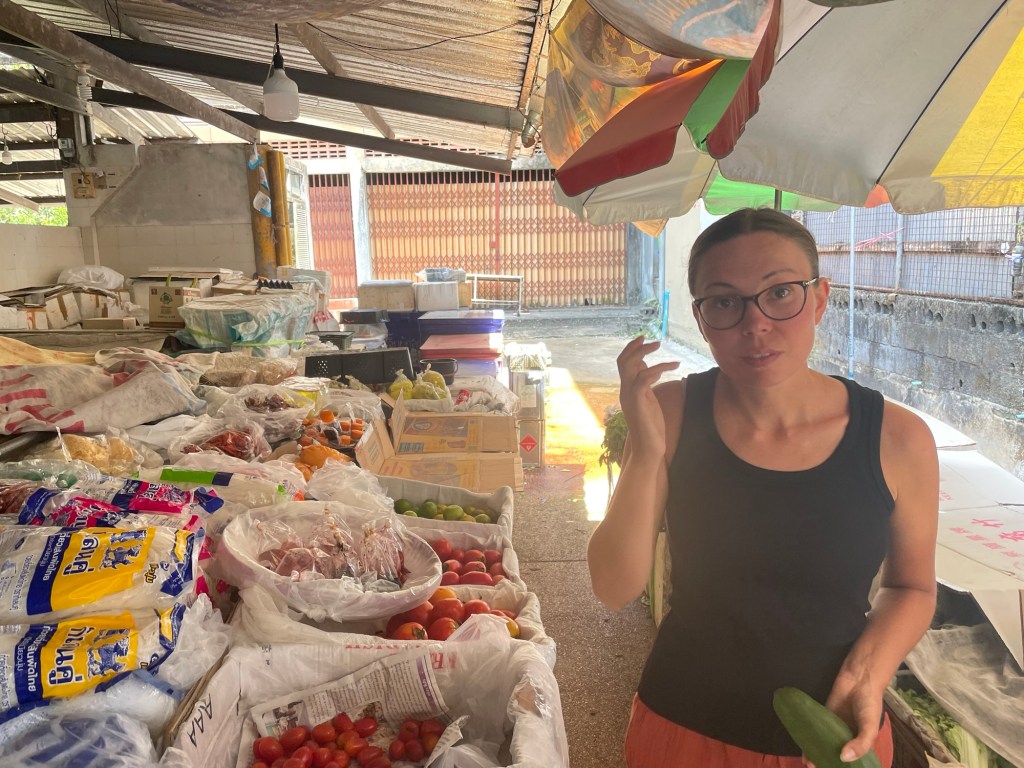 We happily went out to find some food. There weren’t any restaurants we fancied our chances of a vegan meal at, so we went to find the market. Opposite the supermarket was a market but only one stall. We picked through the piles of food, and found a green papaya, purple sweet potato, baby aubergines, limes, chilli and garlic. 20 baht, 50p. Mad. Just outside the supermarket a woman was selling tomatoes. Another 20 baht for four. In the supermarket Frankie spotted the last, hidden packet, of tofu.