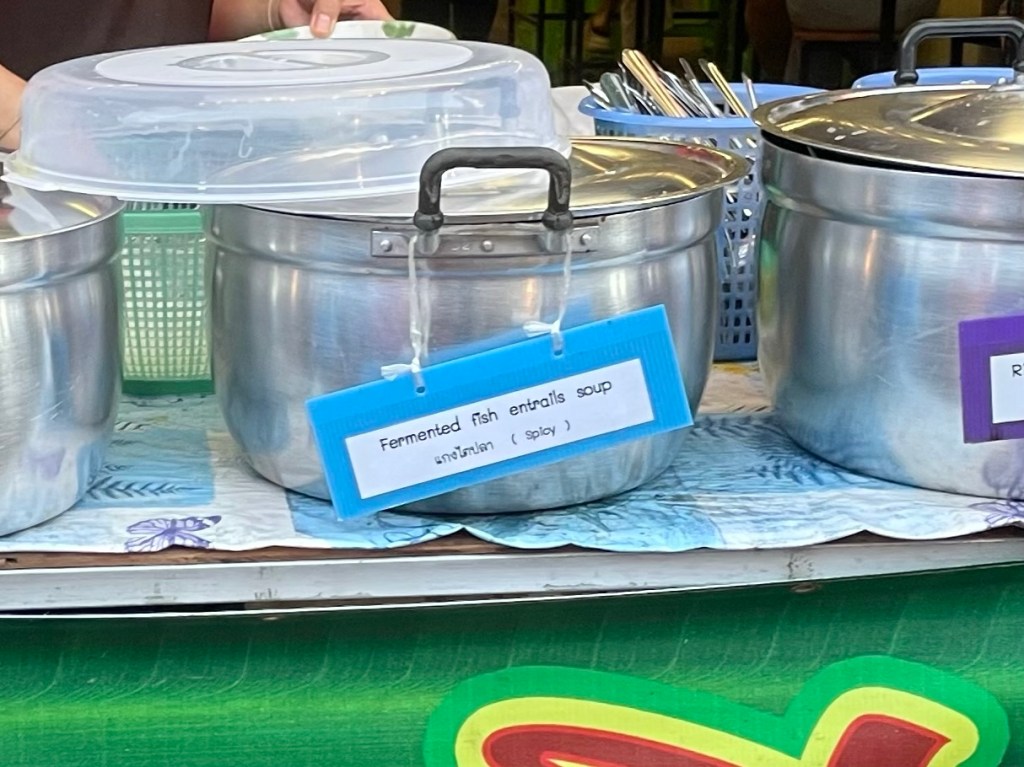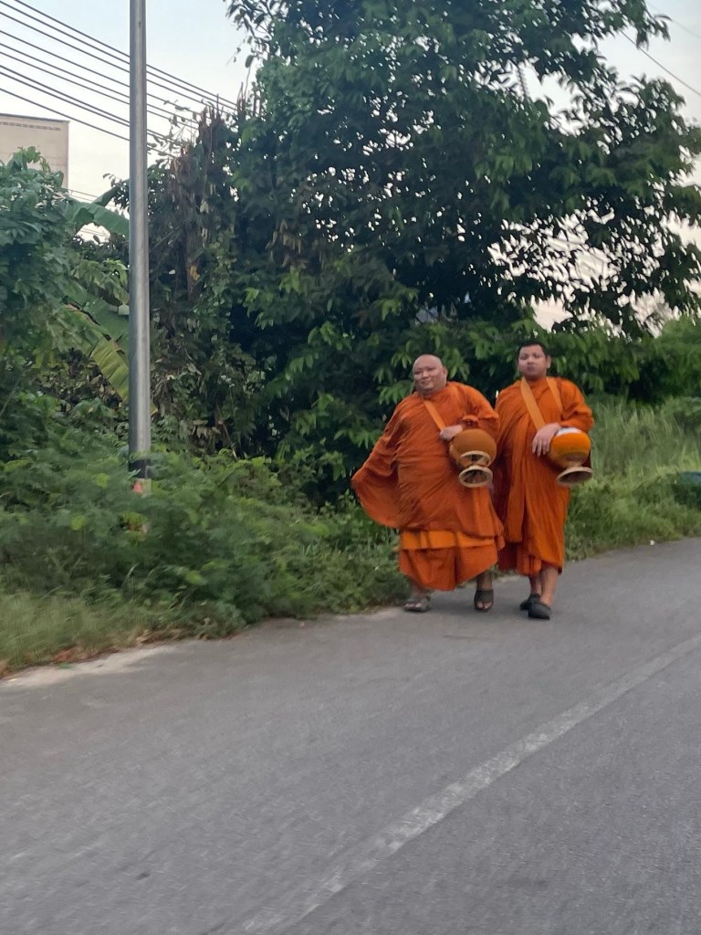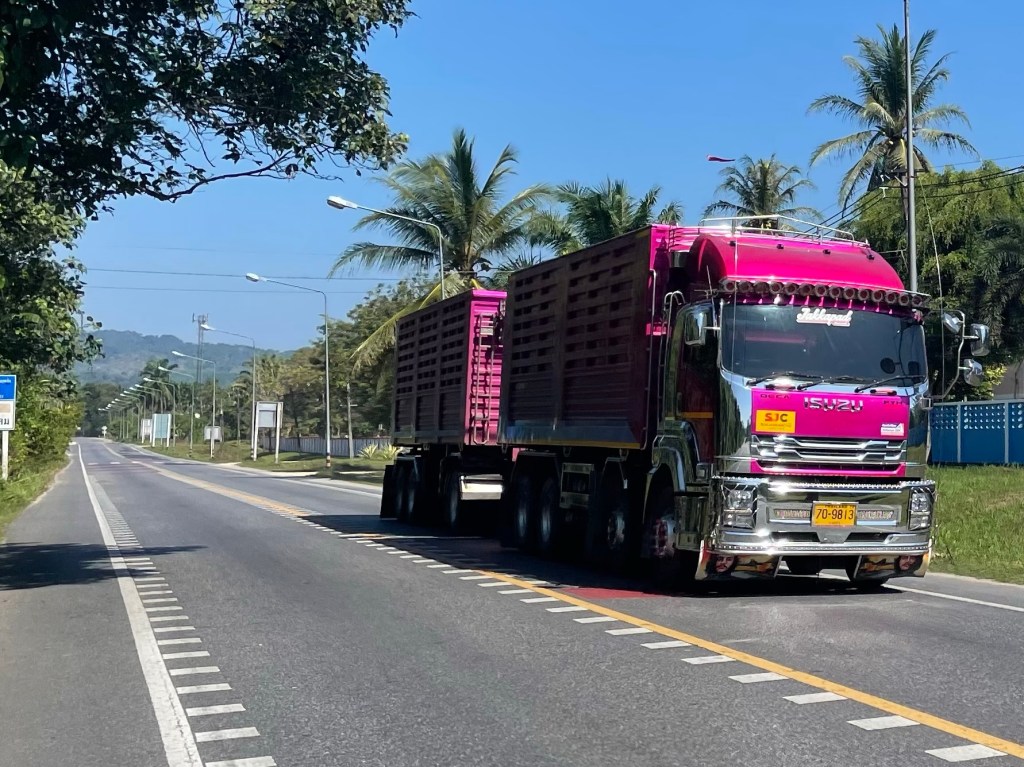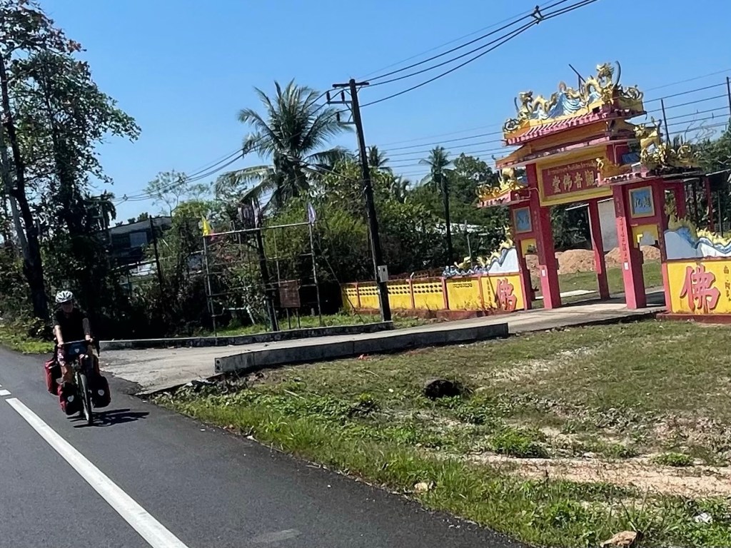 Frankie was finding it to be a very hard day to find the energy to cycle. She hadn’t slept well at all. And was obviously drained. We stopped for some coconut milk pancake things. They weren’t the same as the day before. A green jelly made of pandan, the extract from a leafy plant, with a creamy coconut topping. They were delicious. A great breakfast. Roadside food stalls is one of the best things about cycling in Thailand we have decided.