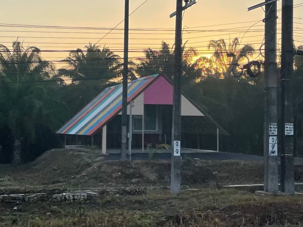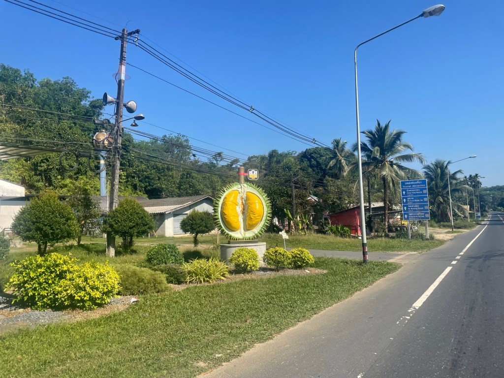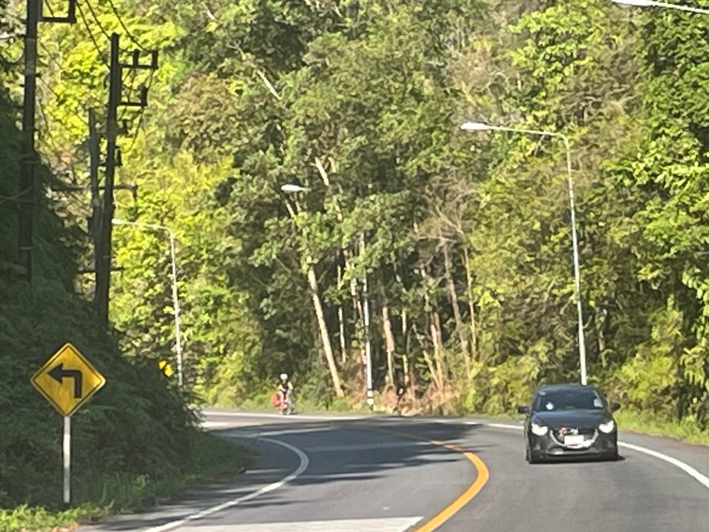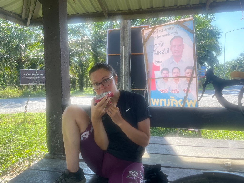 We went through jungle and palm tree plantations for a bit. Then we carried out the long awaited climb. It wasn’t long, not really. It was seriously steep in places, and the switchbacks had deep corners that we had to try and avoid, traffic dependent. It was pleasantly not as long or as difficult as we’d feared. The descent was glorious, a slow gradual descent so we could pick up speed. At the bottom we stopped in a bus stop to eat a dragonfruit. They’re easy to peel and despite the fact a lot of people think they lack sweetness or flavour, we’re big fans.