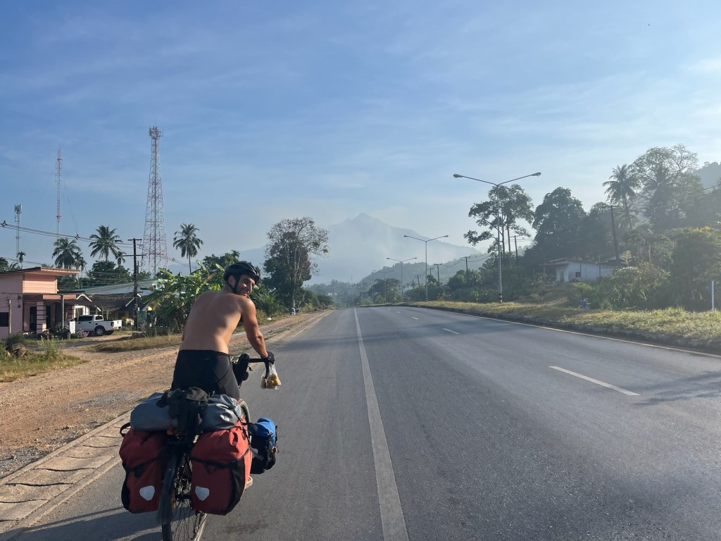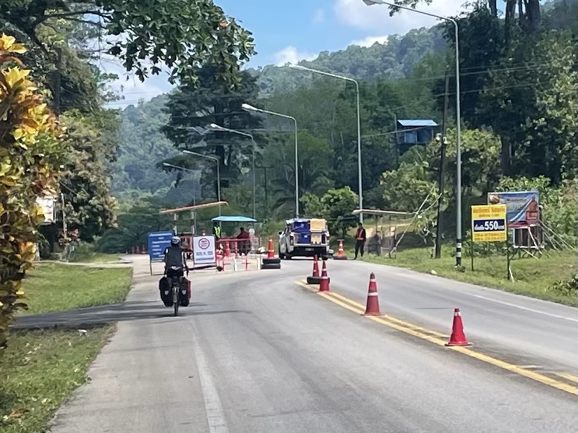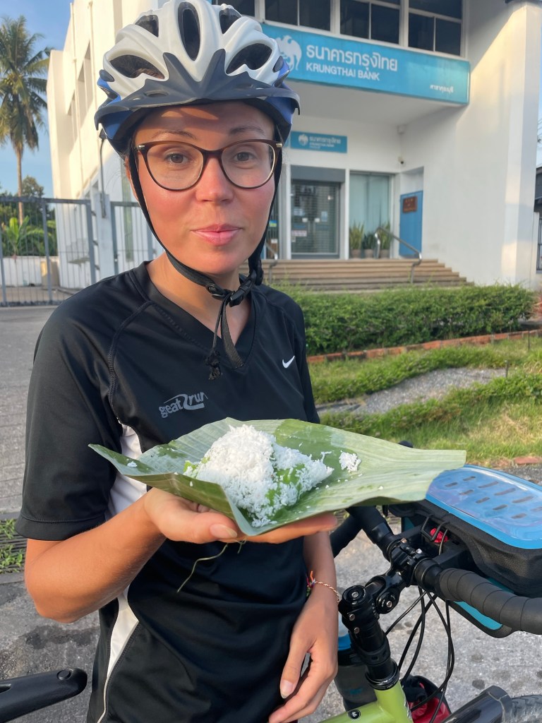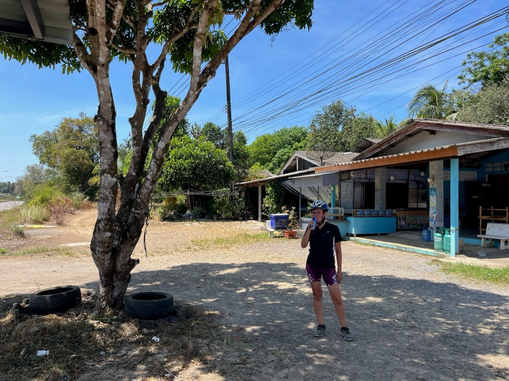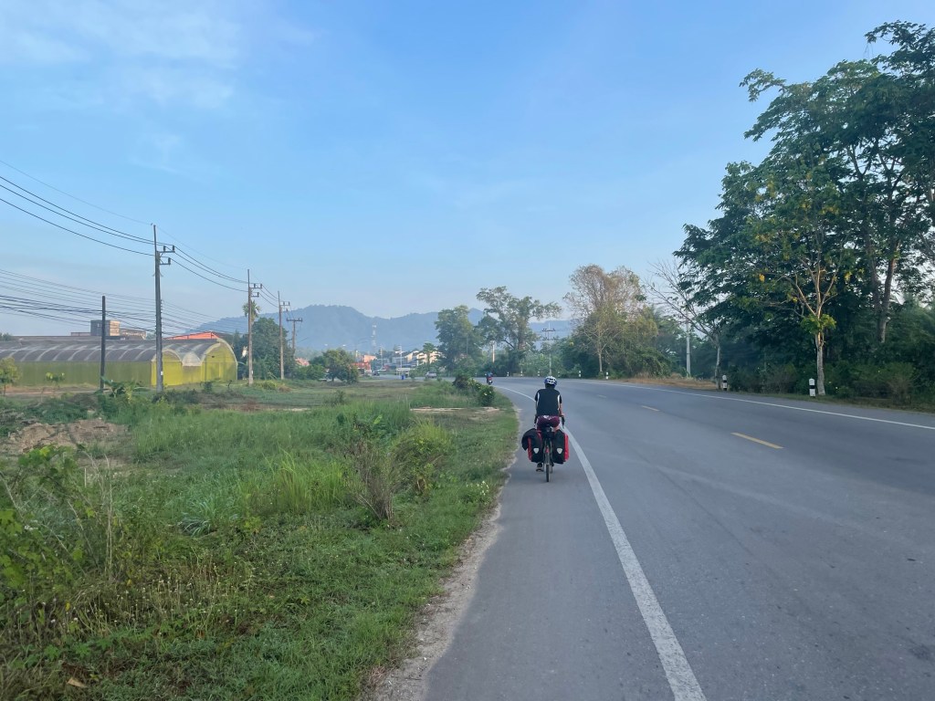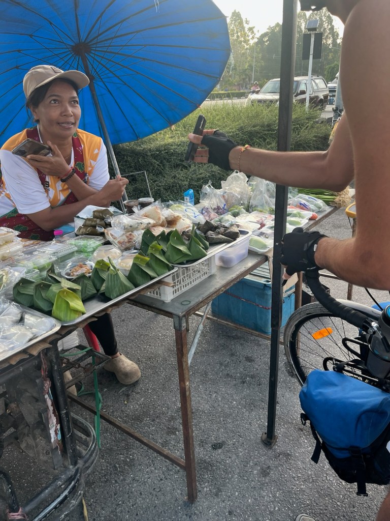 It was a nice quiet night and a good sleep. Though we had to adjust the air conditioning a lot during the night. Otherwise it got too cold. We made coffee and set out as soon as we could. Less than 10 minutes down the road and we in a busy town with some roadside stalls opposite a school. We bought some breakfast, some more panang based pudding and a lotus seed dessert. We were pretty sure they were vegan. We did check multiple times using google translate.