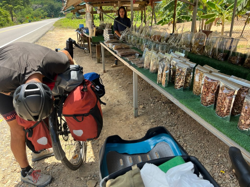 Unfortunately Frankie’s belly wasn’t feeling so good. So we stopped for some nuts and to glug some water. Jonathan went into a local shop and perused their fridge. Some of it was their own food and not for sale. Ended up with a little bottle of passionfruit juice and some peanut brittle.