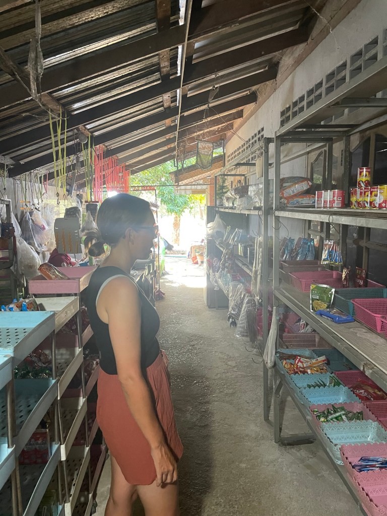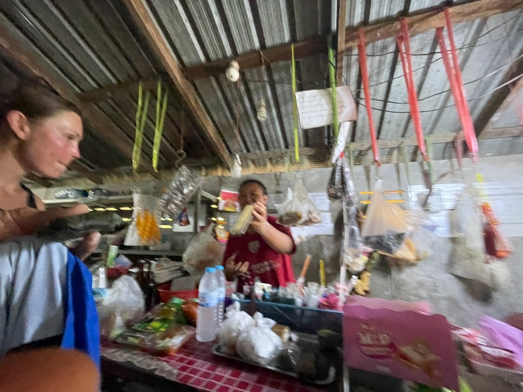 It was in someone’s house as always. A man was outside shelling coconuts. The store was a couple of long narrow shelves. We managed to find instant noodles without fish in them. That’s a rarity. Also pickles, some dried green peas, and crisps. They even had tomatoes and cucumbers. Only one small bag of each. They were so generous and even gave us a little wrap of rice with jackfruit in it. It’s phenomenal how kind people with so little are. Made us feel a bit sick for the abominable greed that exists at home.