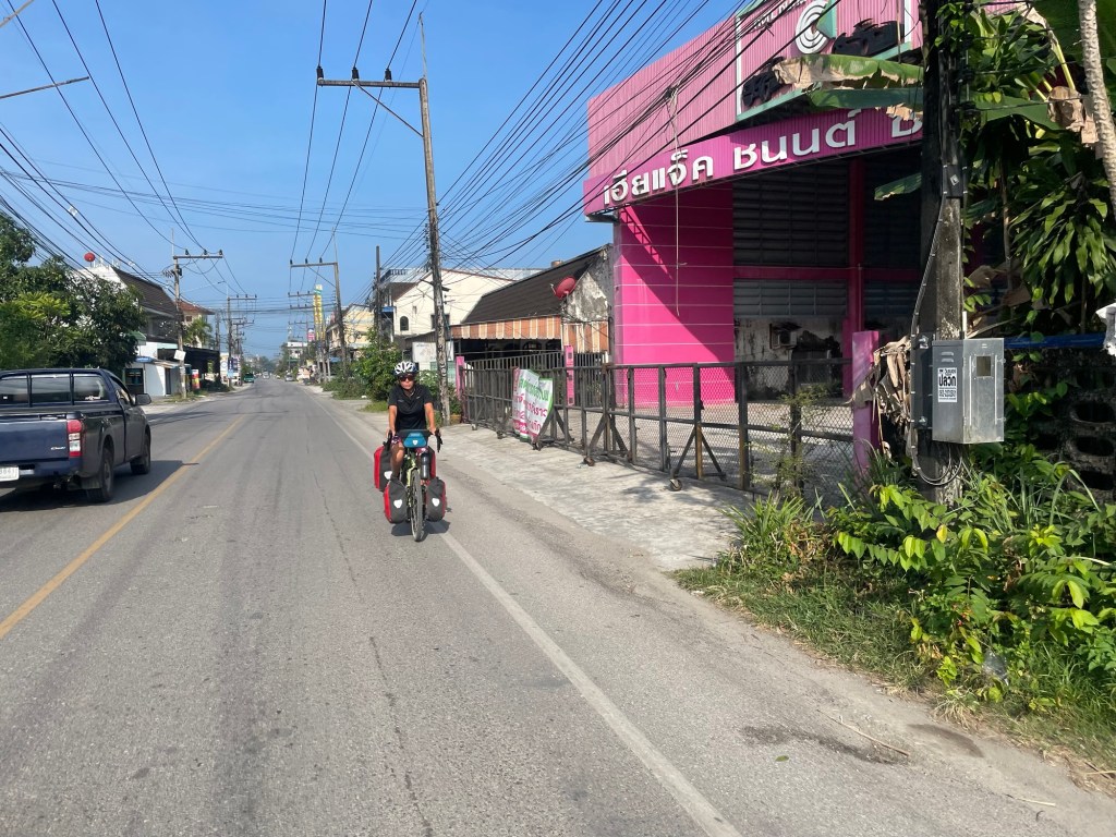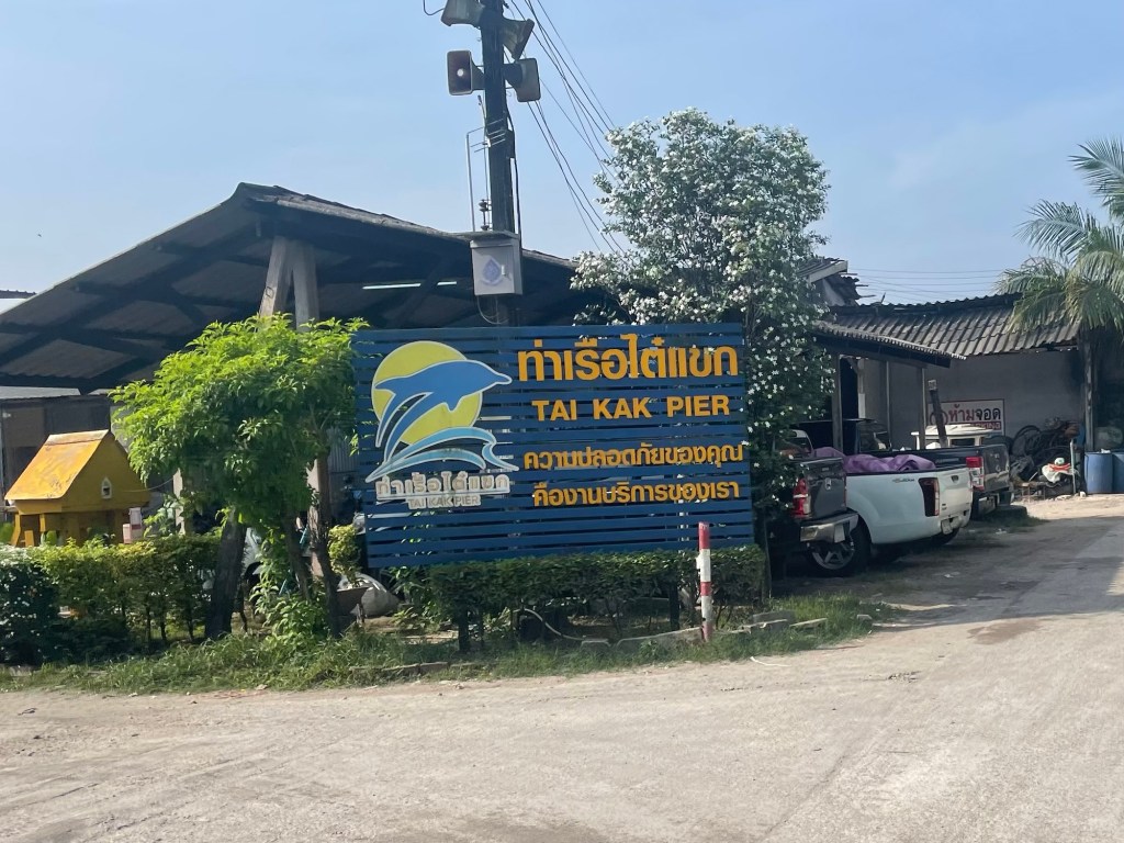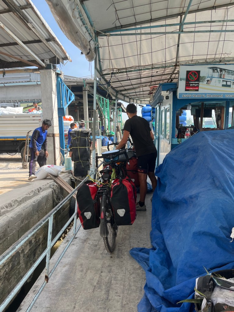 We sent a whatsapp message to Tai Kak Pier, which rather than just a pier seemed to be the name of the ferry company, to confirm the passage of the bicycles. They shot back a simple message that it would be 100 baht per bicycle. At around half 8 we left the hotel and started the 8 kilometre ride. It was a bleak ride, on busy roads, surrounded by cars, scooters and trucks. On the way we stopped at a 7-eleven to get coconut milk and coffee. We were anticipating higher island prices.