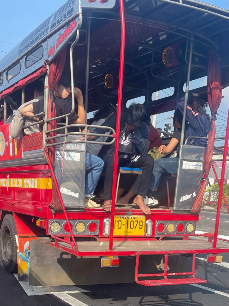 The road towards the pier was a long, straight and monotonous dual carriageway. Taxi-buses passed us frequently. When they were carrying Thai people they were invariably crammed to the brim. After a bit the road turned left and then became bumpy and poorly maintained. We were passing industrial fish processing places, and an ice factory. Ice is huge business in Thailand that’s for sure. It was being churned out into the backs of large trucks.