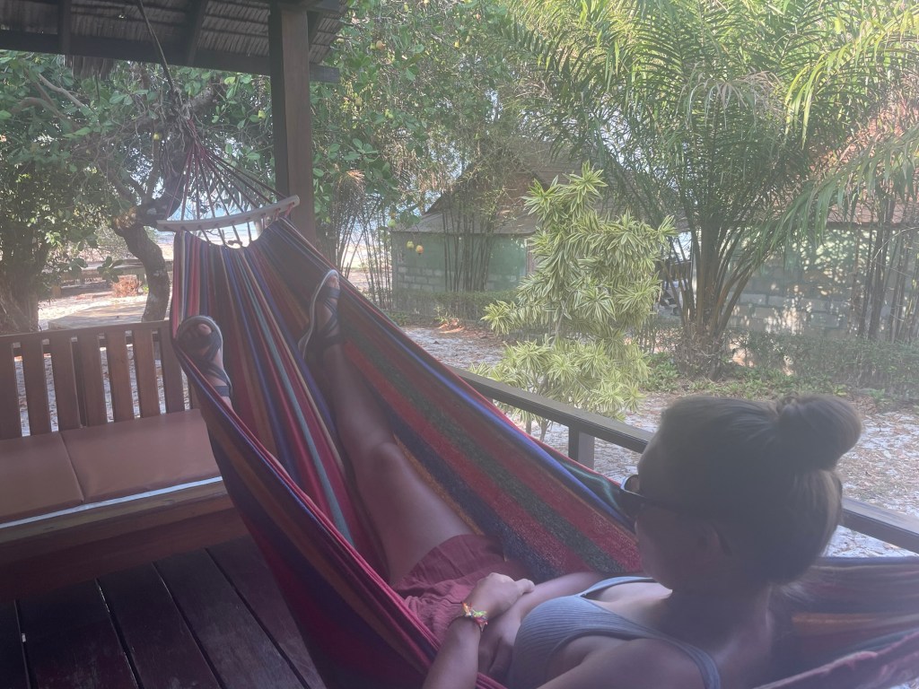 Our bungalow was very pretty. We had a view of the sea, a hammock but no air conditioning. Which we’d expected. Well there was an air conditioner but we told it was another 600 baht a night. We’d already paid 1750 per night and felt that it was a bit cheeky especially as it was powered by solar. Paul owned another resort on the island too. It was going to be another weird place.