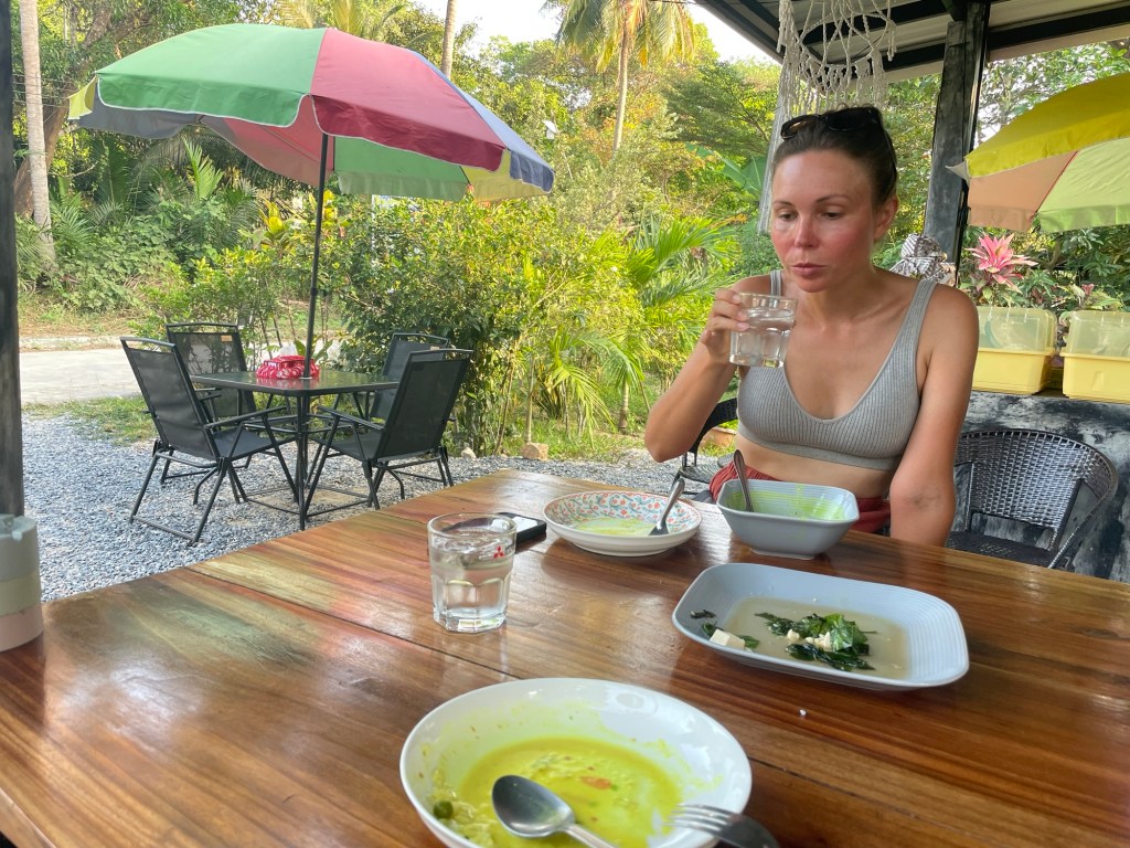 After a few hours of enduring the sweaty heat we went out to find some food. We walked about a kilometre to a place run by a woman called Supranee. She cooked fresh vegetarian food from her garden, and had moved here 9 years ago to escape her lifestyle of gambling. It was nice food but expensive and the portions were small. Tourist island life would take getting used to again.
