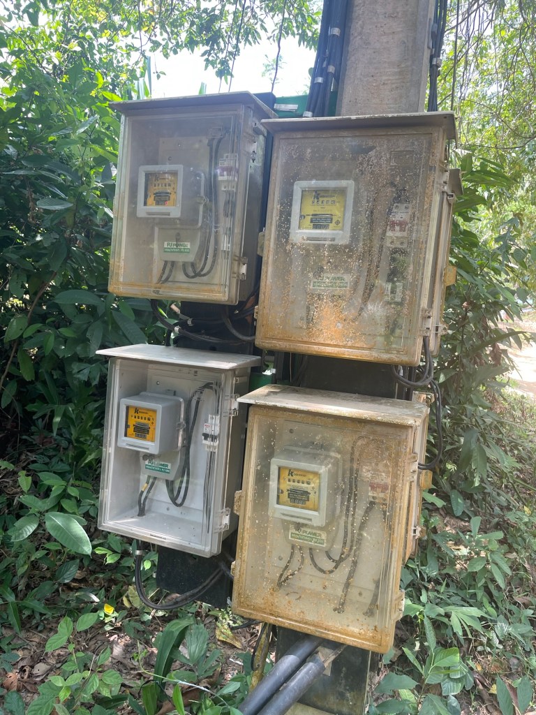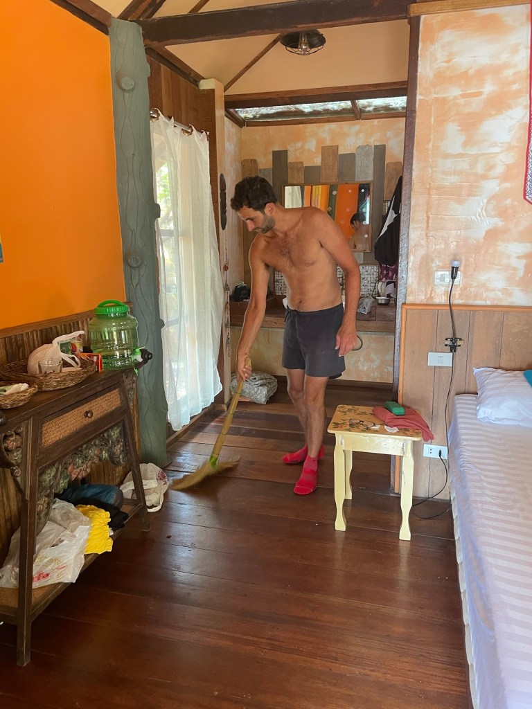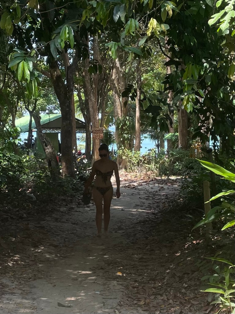 We passed some Thai people building another cabin. We assumed to be rented out but we couldn’t be sure. The track off dustier and rutted from here, and went over a little hill through the jungle. Down the other side was Ao Kwang Peeb. It was supposed to be a quieter place but there were plenty of people that we could see. There was also an abandoned resort. Old bungalows abandoned. A deserted bar and restaurant. Maybe another victim of Covid? We explored and found one bungalow that someone was living in.
