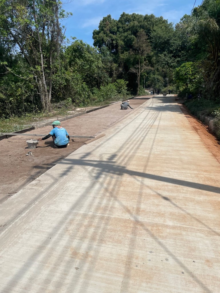 It wasn’t a surfaced road, but rather a dusty track, it didn’t discourage people from using it though. The Sun was already making us hot and we tried to find the shade on the edges of the road. A little way along they had started concreting the road. When we say ‘they’, we mean a group of workers who were doing it all by hand. It was laborious, unforgiving, work. Because one side of the road had been concreted, the scooters kept going down the wrong side, unable to mount the concrete slabs. We tried to make the tourists smile as they careered past us. We reckon the stress of using a motor vehicle serves to make them a little grumpy.