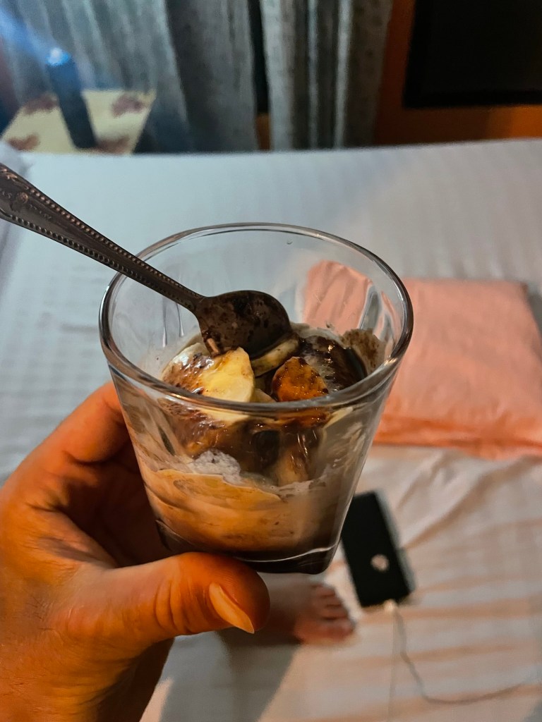 When we got back we used our glasses and first put a layer of peanuts, then dates, banana and coconut milk. Drizzled with melted chocolate. It all combined to make a delicious mulch. It was so good we made it twice.