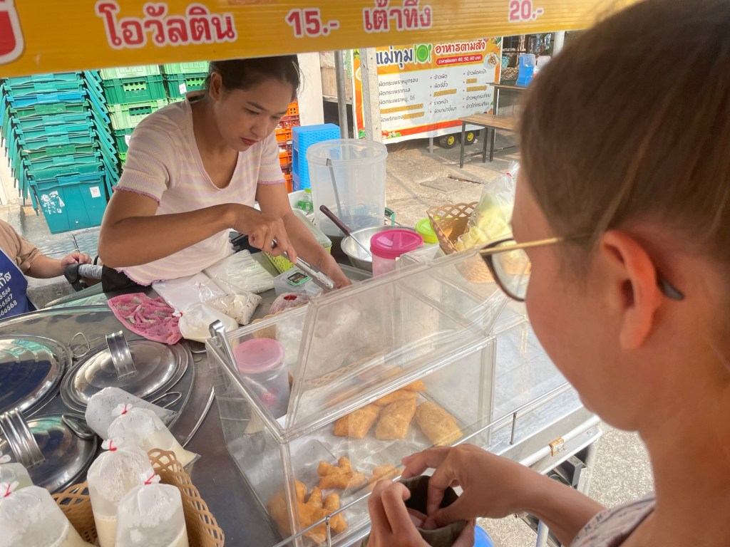 It wasn’t so much of a shop as a cart. It sold fresh soy milk and tofu ‘salad’. Also some fried dough sticks which we snapped up. We sat at a bench to dip our dough in the tofu salad. It was sweet milk, full of chunks of soft tofu and tapioca pieces. All around us, simultaneously chaotic and calm, the Thai way of life was happening.