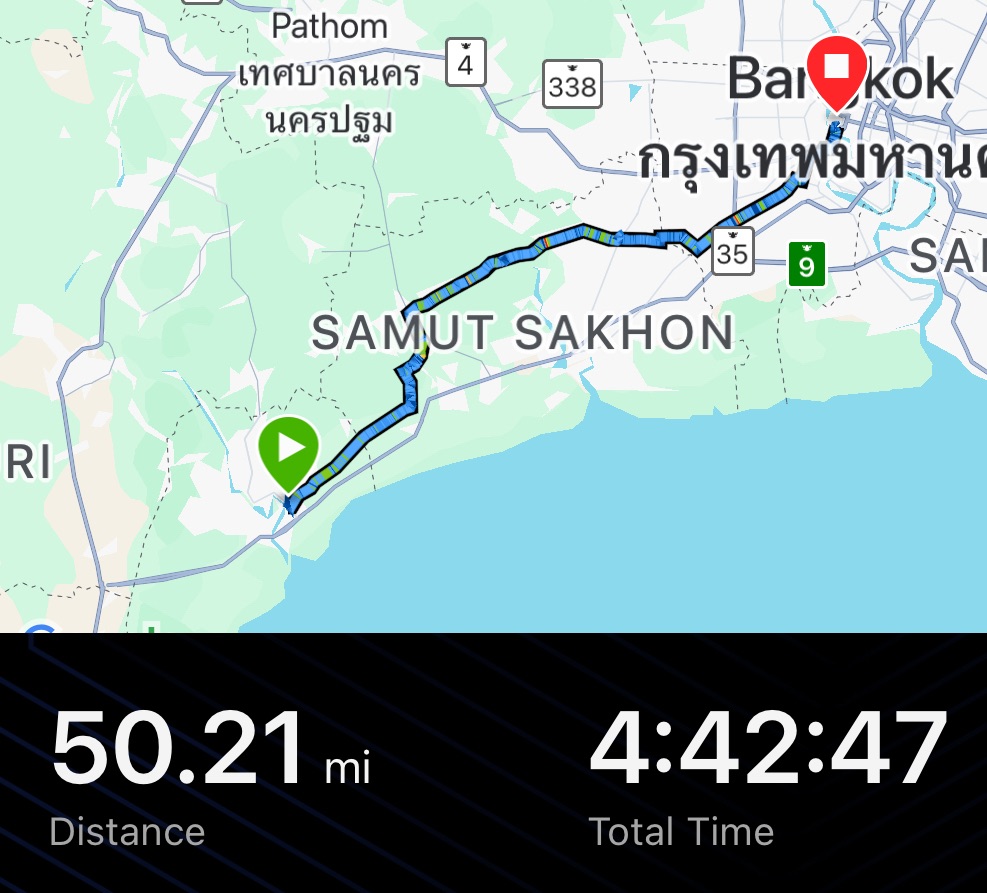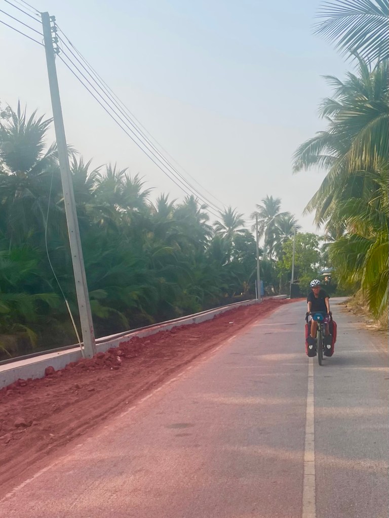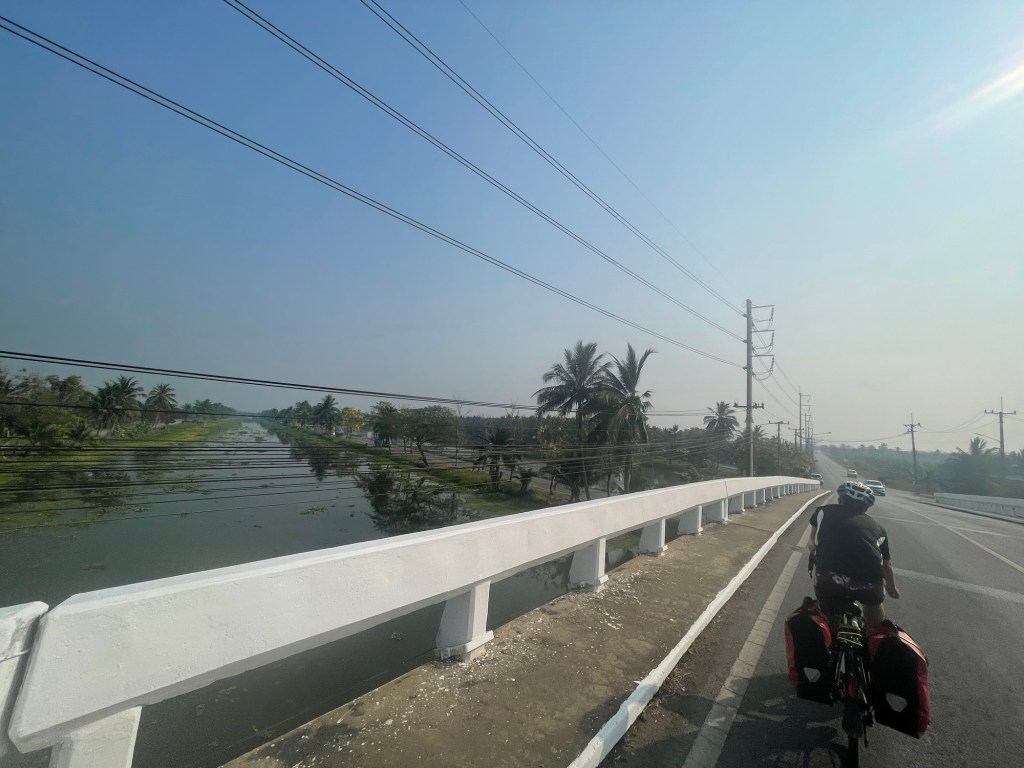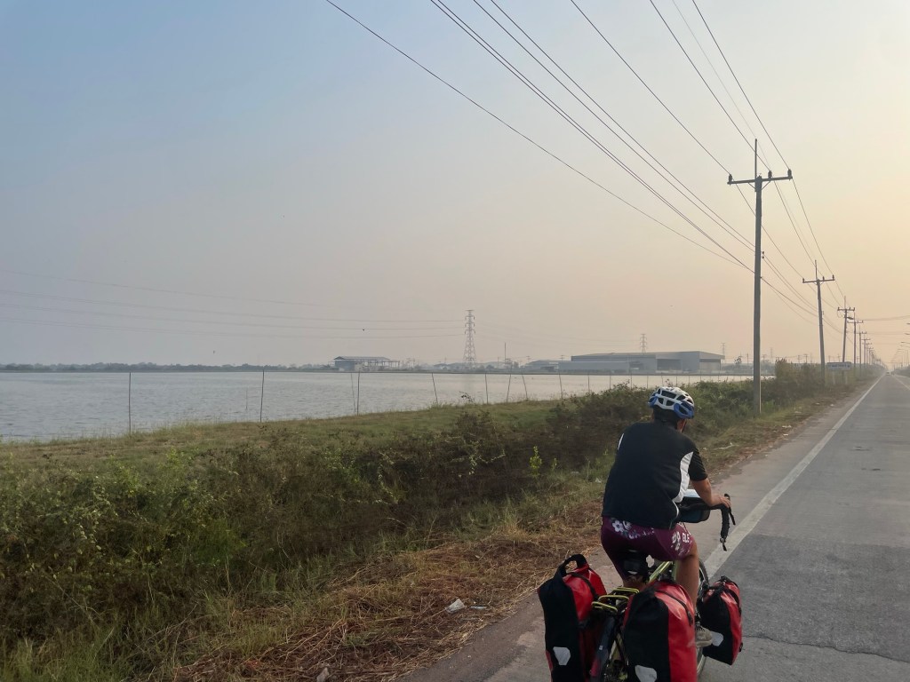 Initially we had trouble accessing the road from the hostel. After the tinniest stint the wrong way on the highway, (no one bats an eye.) We were on route 3092. A long straight road that led towards Samut Sakhon. We had good views of what could only be described as industrial wasteland. Mostly dominated by salt production. There also seemed to be a large area of wetland. It wasn’t clear if it was man made, but we were in flatlands. The benefit of course being there was zero elevation.