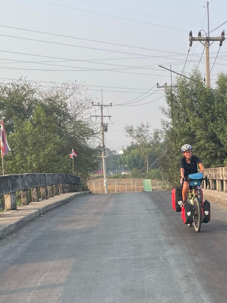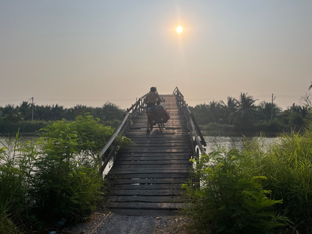 The Sun had turned from its glorious morning orange to a blander yellow. Yet it was only 7:20am. We turned off onto some friendly back roads. Past experience had taught us to be wary of Mapy. A nice looking temple appeared before us. A perfect opportunity to stop. We hastily ate our coconut pancakes and deep fried dough balls. Soon we were climbing. Not hills but steep concrete bridges. Then we had to hike up a rickety wooden one. We thought Mapy had already let us down. But a moped crossed just before us.