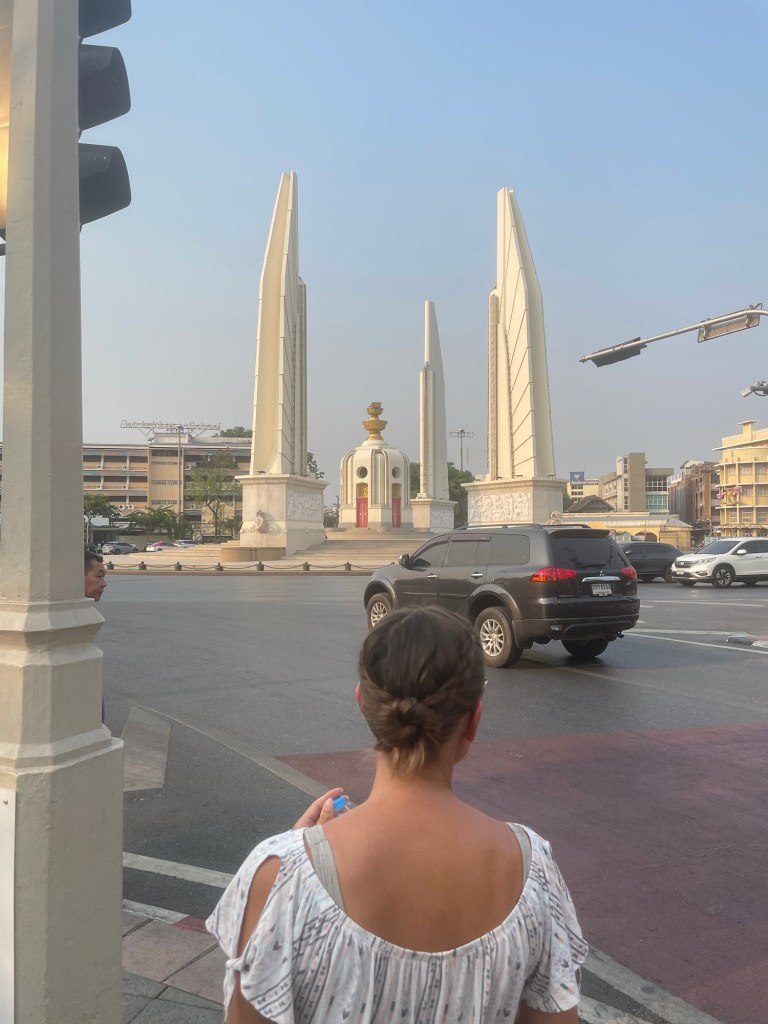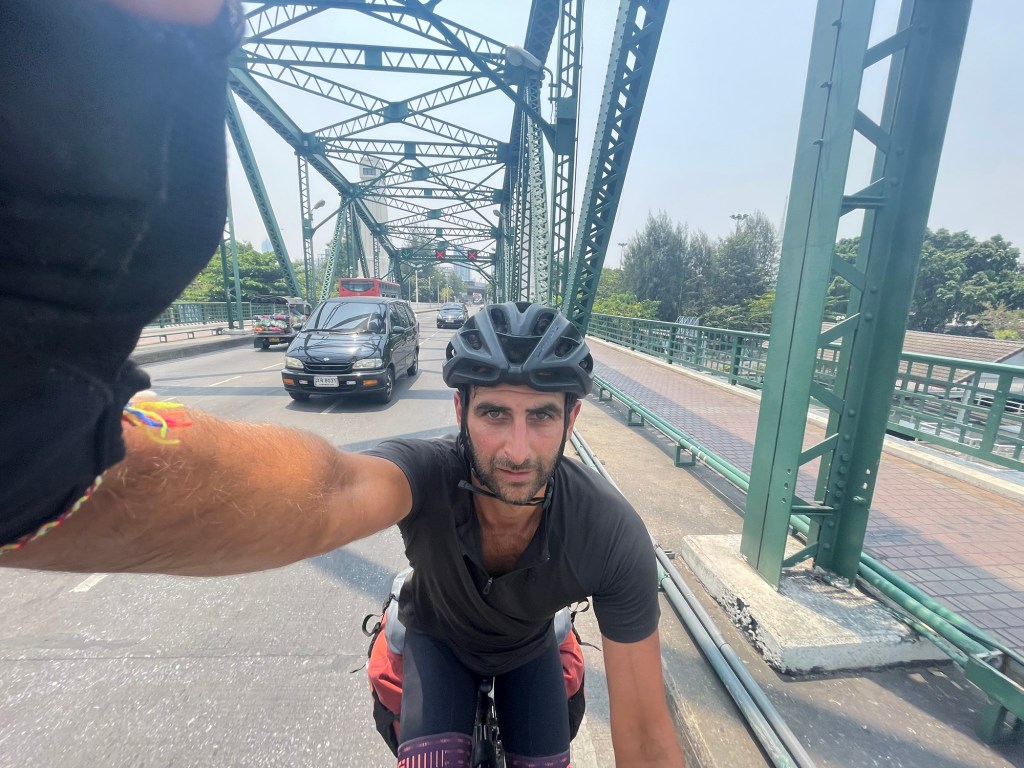 The final river crossing was that of Chao Phraya. We merely had to navigate some roadworks then cross the three lines of traffic that were heading towards the newer expressway so as to reach Memorial Bridge. An older, steel built beauty. We had fabulous views, though we were still overwhelmed by traffic. A big trawler was chugging up the river. Glinting temple roofs caught our eyes. Once over the river, and in old town Bangkok, things got easier. A few side streets and we’d arrived.