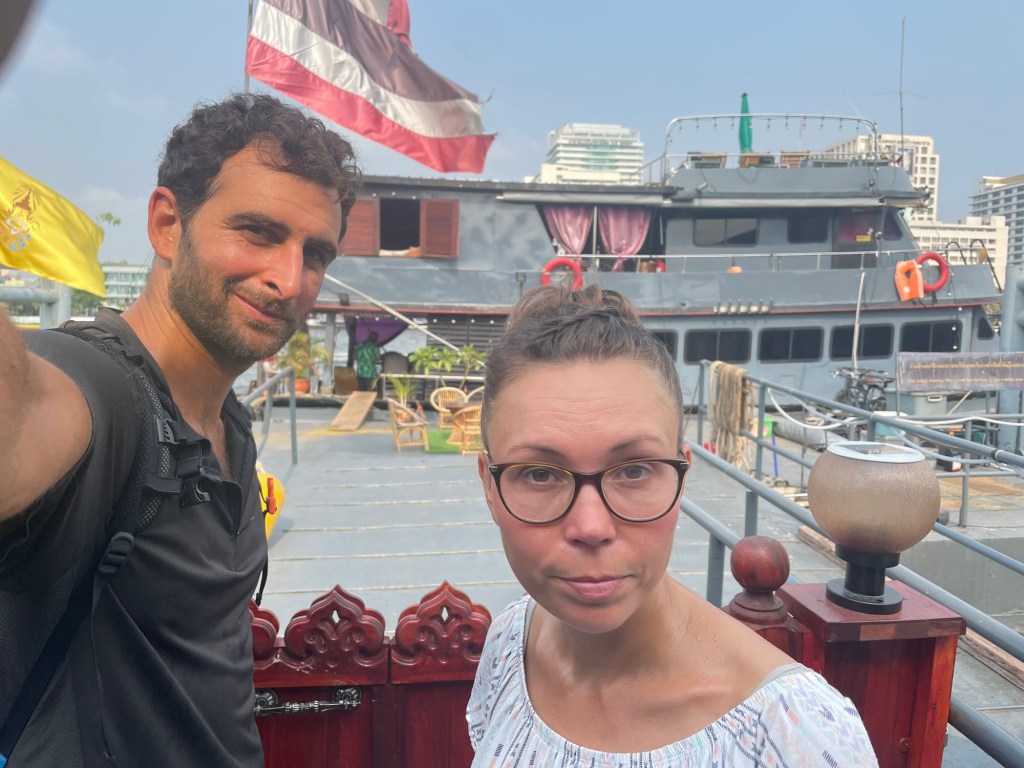 Right at the end of the market was a wooden sign with ‘Sabai sabai’ written on it. Below the sign were two wooden gates. And behind them a boarding platform where the vessel sat bobbing up and down fairly vigorously. We stood there analysing the situation, it looked pretty safe for the bikes. Then Roger walked down from the upper deck. He sounded slightly, but not strongly, German. He’d bought the boat 9 years ago, and during the quiet of ‘covid’ secured the dock. He happily discounted the price to avoid booking platform fees. We arranged to bring the bikes over the next day.