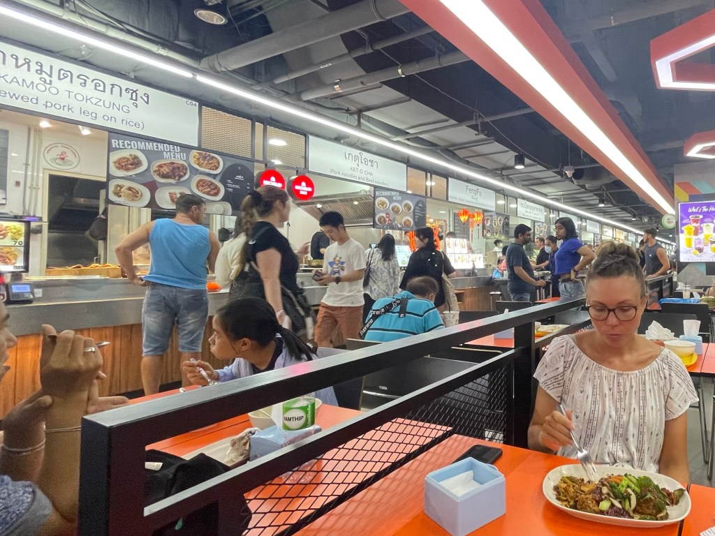Finally, we fancied some savoury munch. We crossed the sky bridge and entered yet another mall. The MBK centre’s food court was the entire 6th floor. One of the hundreds of outlets was the ‘vegetarian’, but completely vegan, Rabiengboon. We had to load money onto a special card first. It was typical Thai cuisine. We just picked a variety of vegetables and plant proteins before ladling the spicy and sour condiments on top. We’d started messaging another couple staying in Bangkok. They were coincidentally leaving in the same direction. We arranged to meet them for dinner.