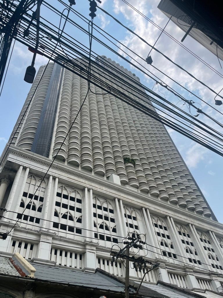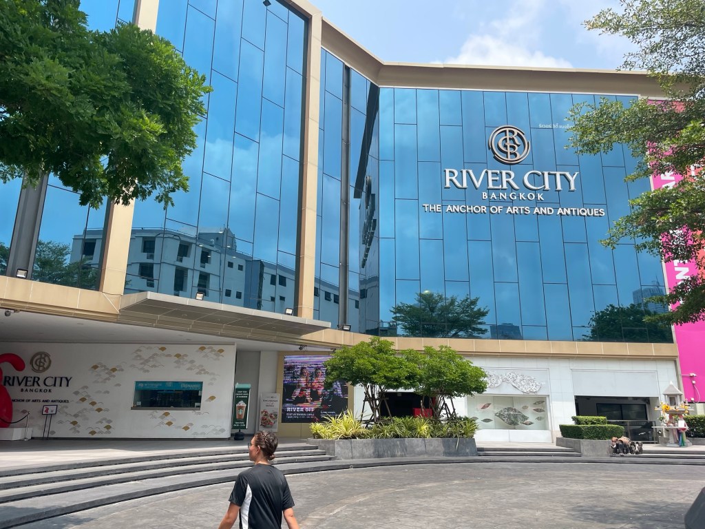 There were tourist boats for sightseeing as well as normal boats more like the underground. Also with tourists. We took the yellow line to Si Phraya, about 20 minutes down river. Along the river were temples and grand sky seeking hotels. We went first to River City. A shopping mall cum art gallery. It immediately won points for being air conditioned. We were quickly coming to the conclusion that Bangkok was already uninhabitable. The temperature and humidity meant walking wasn’t an option.