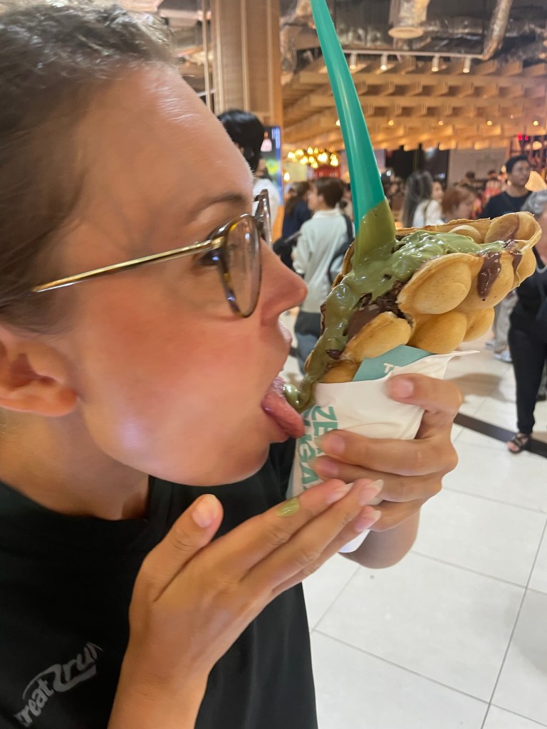 Our UPF bubble waffle didn’t disappoint. It was freshly cooked waffle batter, filled with zero sugar, but definitely sweetened, chocolate ice cream. Pistachio sauce and granola on top. Sitting in the food court, another couple even got food envy. After clearly bumbling around searching for the vendor, they plucked up the courage to ask us.