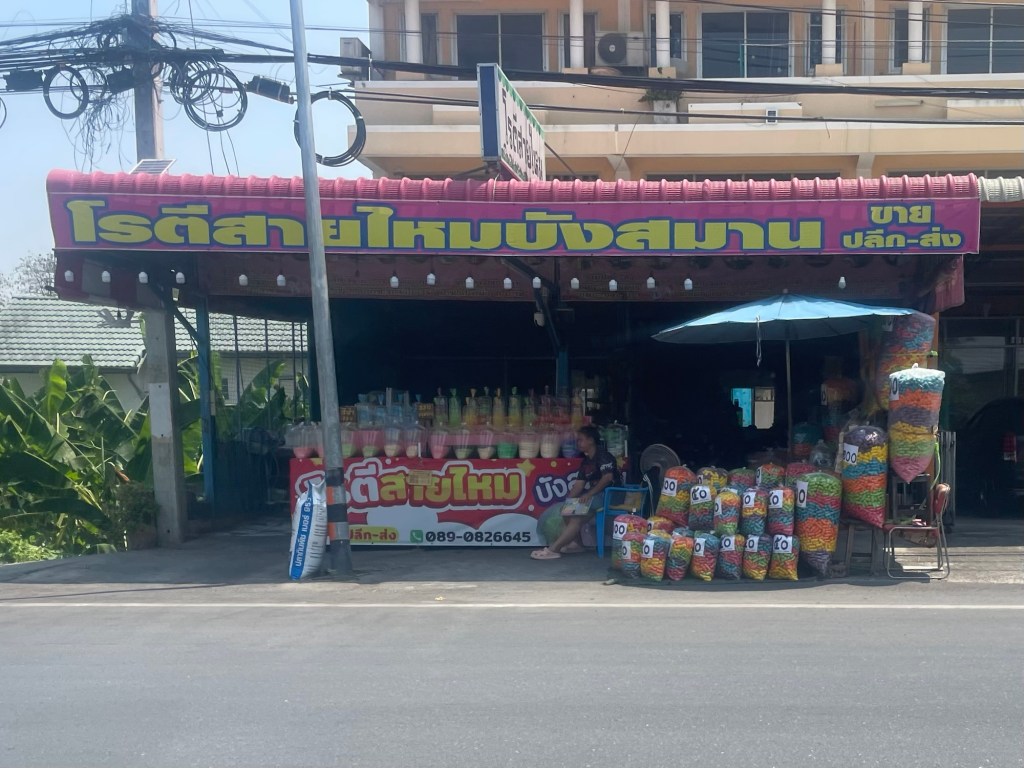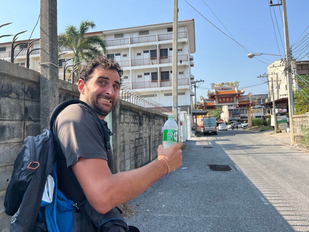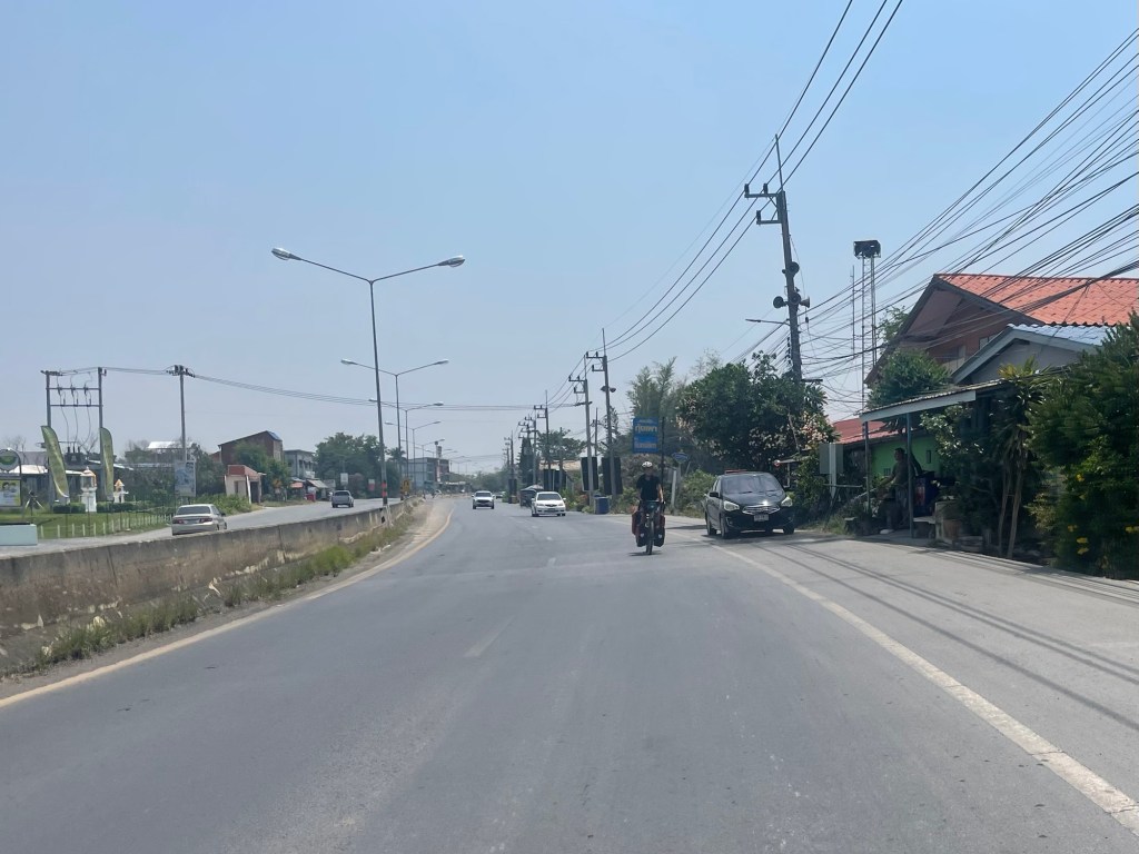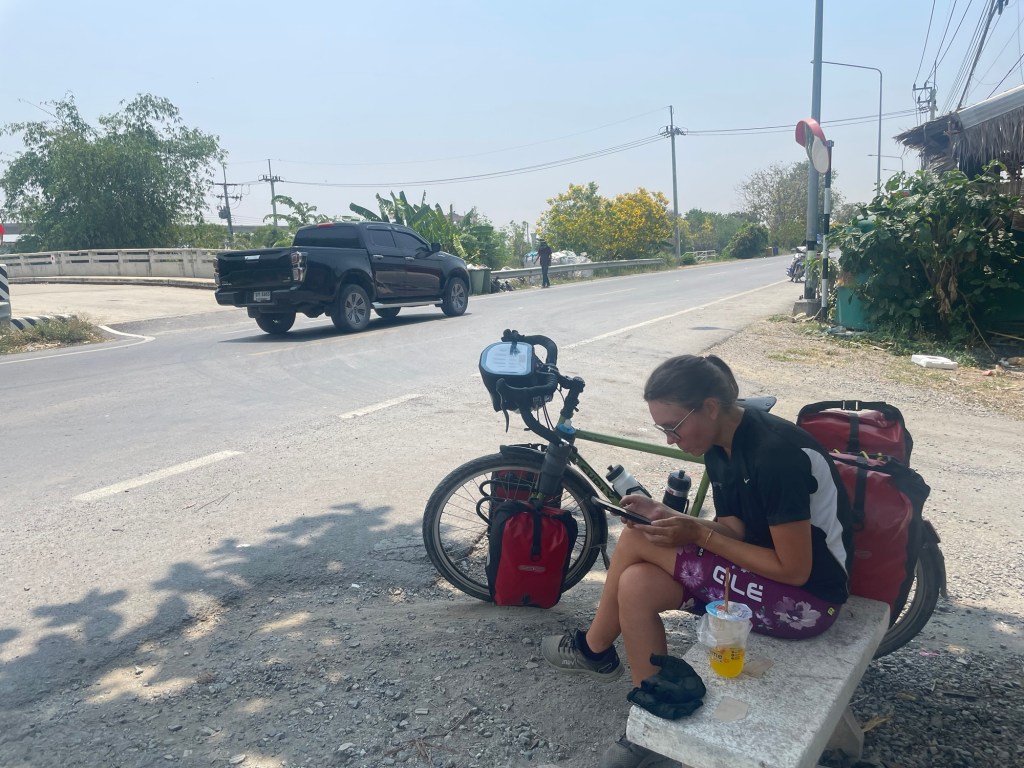 The road is perfectly straight because it follows a canal. A ‘recommended’ route for getting out of the city. We stopped at one of the many drinks booths for an orange soda. It tasted just like fanta. We took the opportunity to book a hotel. We were finally confident we’d make it to Ayutthaya. We ‘only’ had about 20km left to go. The road was near the river. Maybe it would be nice.